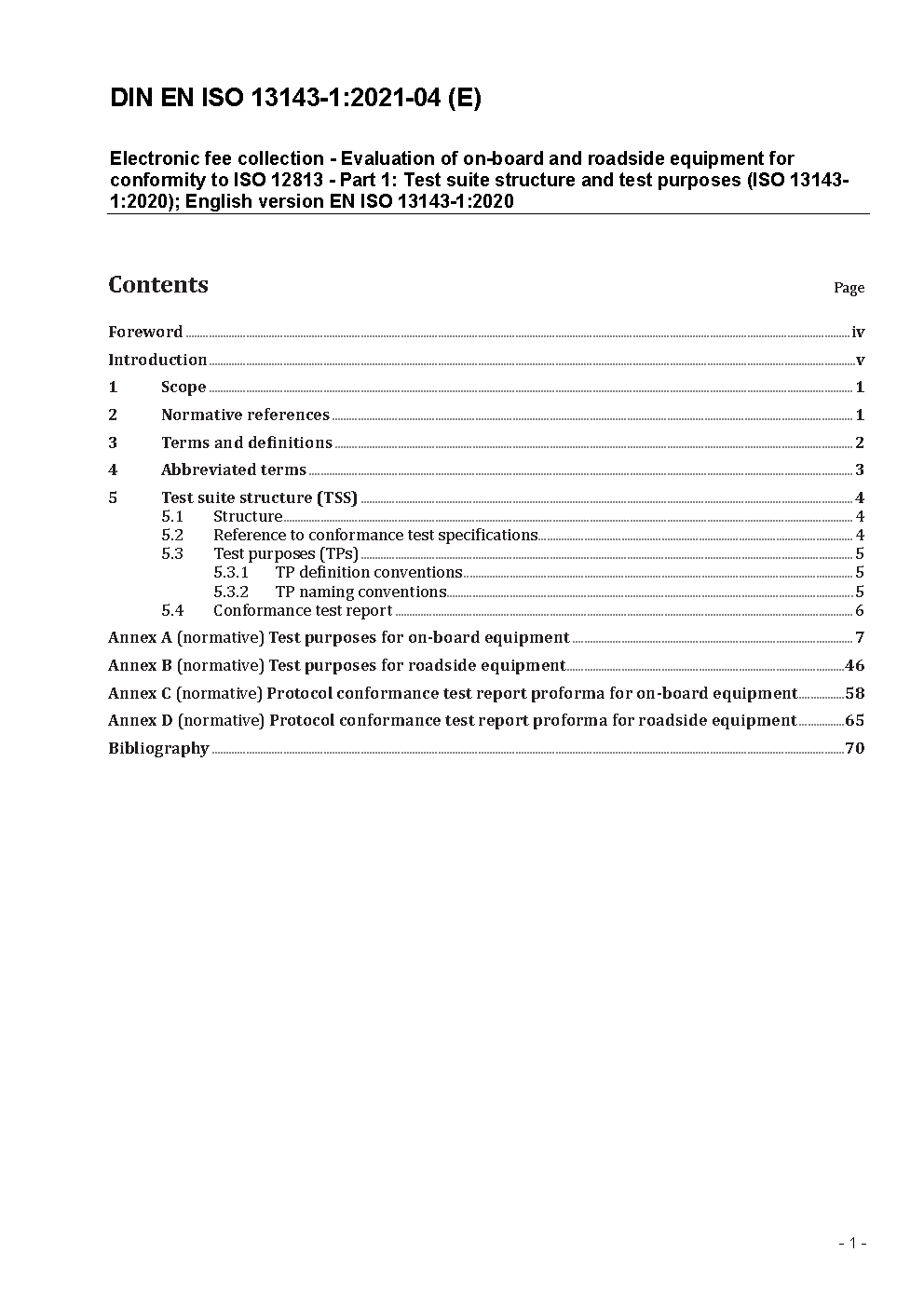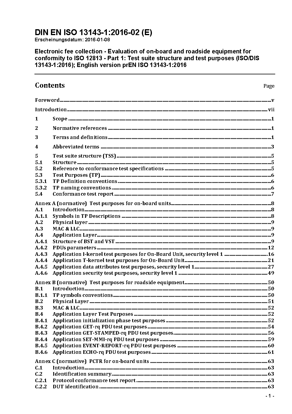 Electronic fee collection - Evaluation of on-board and roadside equipment for conformity to ISO 12813 - Part 1: Test suite structure and test purposes (ISO 13143-1:2016); English version EN ISO 13143-1:2016