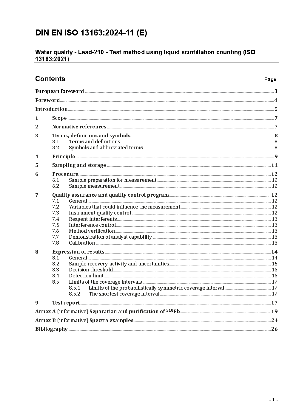 ISO 13163 specifies the determination of lead-210 (210Pb) activity concentration in samples of all types of water using liquid scintillation counting (LSC). For raw and drinking water, the sample should be degassed in order to minimize the ingrowth of 210Pb from radon-222 (222Rn).Using currently available liquid scintillation counters, this test method can measure the 210Pb activity concentrations in the range of less than 20 mBq *l -1 to 50 mBq *l -1 . These values can be achieved with a counting time between 180 min and 720 min for a sample volume from 0,5 l to 1,5 l.Higher 210Pb activity concentrations can be measured by either diluting the sample or using smaller sample aliquots or both.It is the laboratory's responsibility to ensure the suitability of this test method for the water samples tested.