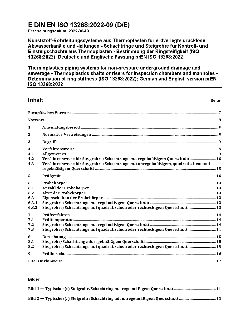 Thermoplastics piping systems for non-pressure underground drainage and sewerage - Thermoplastics shafts or risers for inspection chambers and manholes - Determination of ring stiffness (ISO 13268:2022); German version EN ISO 13268:2023