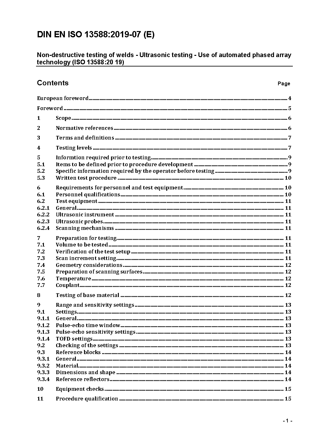 This document specifies the application of the phased array technology for the semi- or fully automated ultrasonic testing of fusion-welded joints in metallic materials of minimum thickness 6 mm. It applies to full penetration welded joints of simple geometry in plates, pipes, and vessels, where both the weld and parent material are low-alloyed carbon steel.