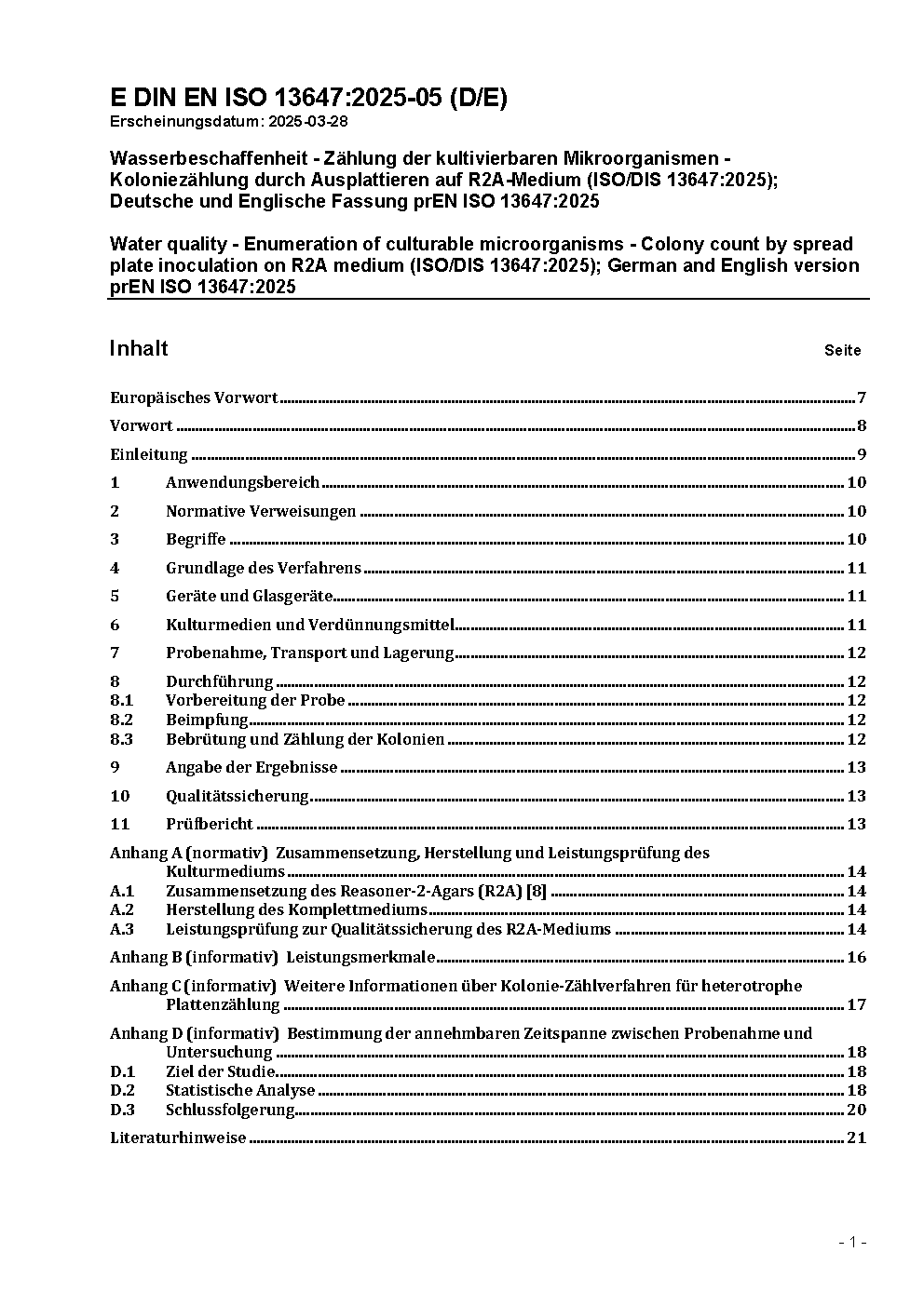 Wasserbeschaffenheit - Zählung der kultivierbaren Mikroorganismen - Koloniezählung durch Ausplattieren auf R2A-Medium (ISO/DIS 13647:2025); Deutsche und Englische Fassung prEN ISO 13647:2025