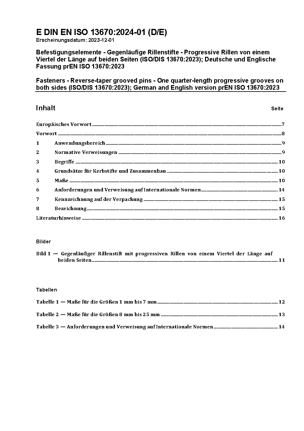 Fasteners - Reverse-taper grooved pins - One quarter-length progressive grooves on both sides (ISO/DIS 13670:2023); German and English version prEN ISO 13670:2023