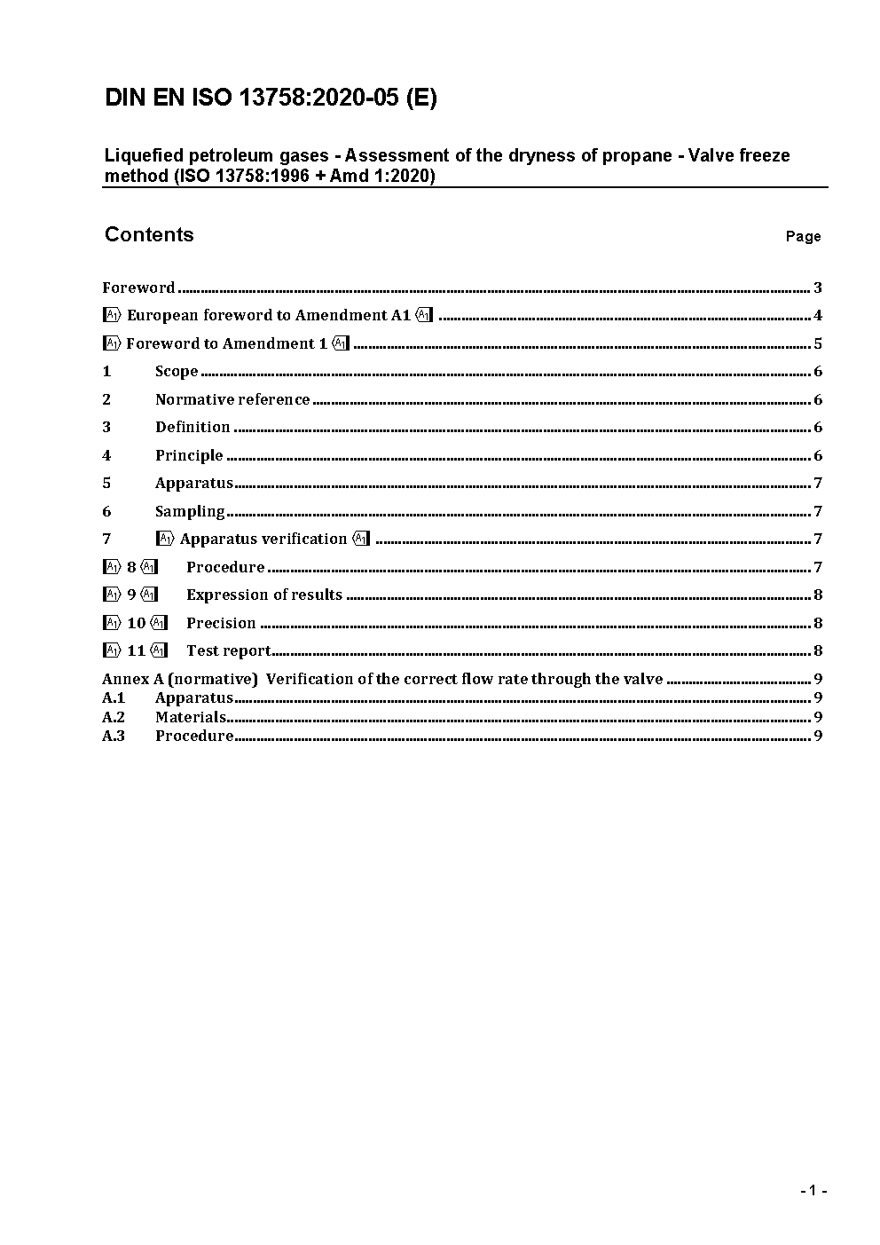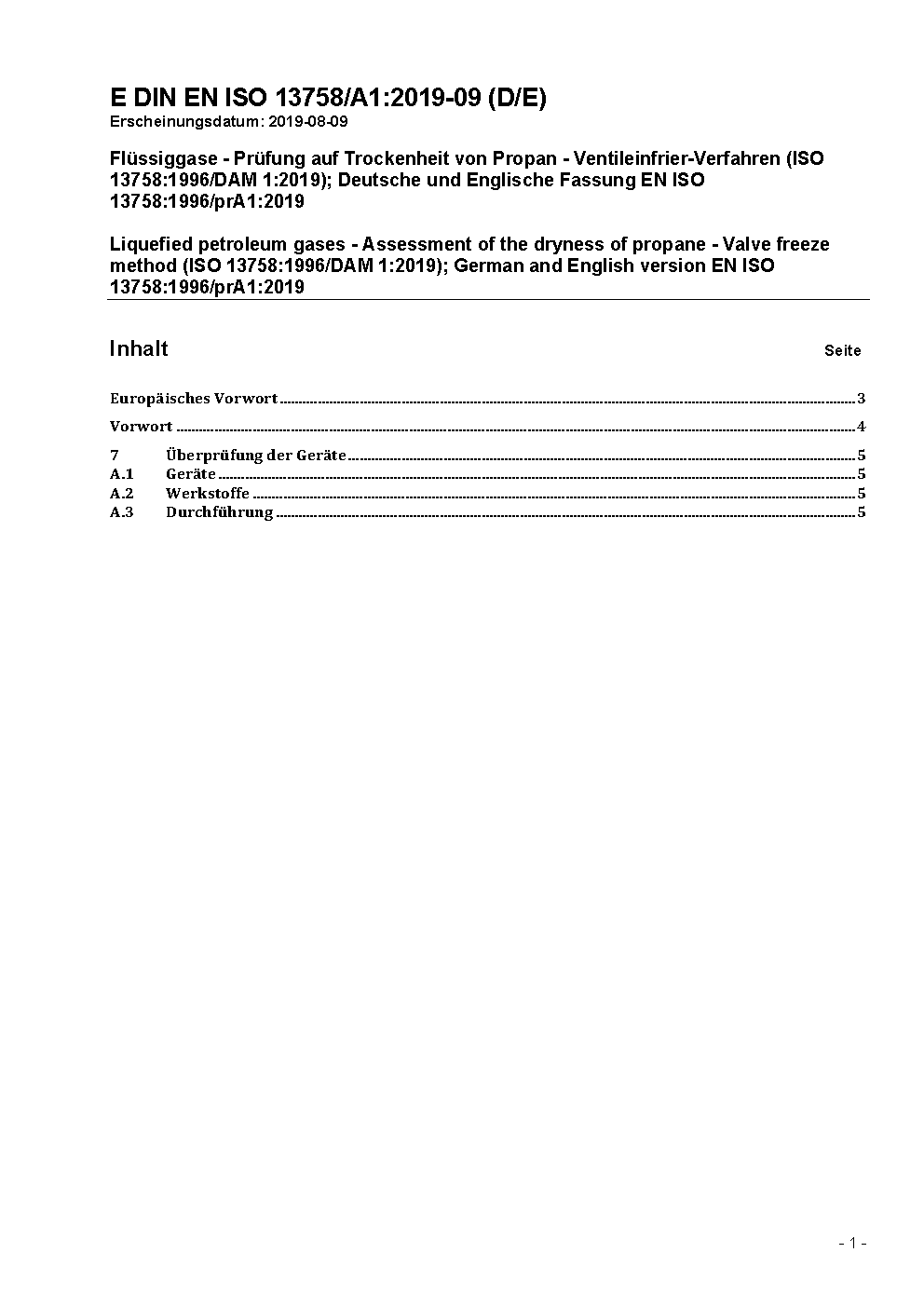 The document describes a procedure for the assessment of wether liquefied petroleum gas (LPG) hydrocarbons consisting predominantly of propane and/or propene are sufficiently dry to avoid malfunctions in pressure-reducing systems installed in domestic, industrial and automotive LPG applications.