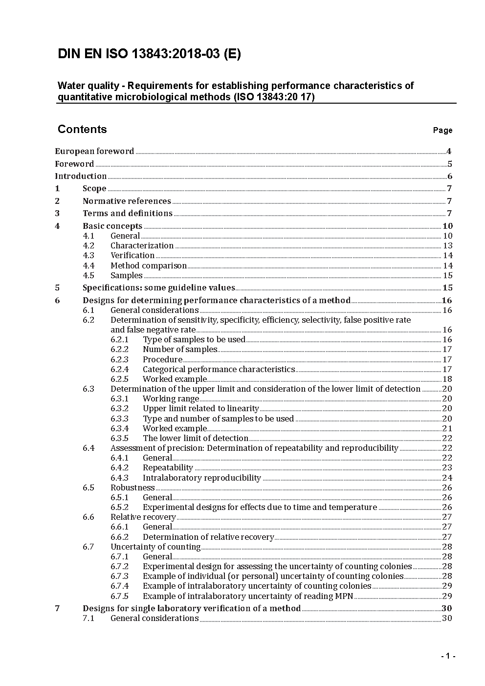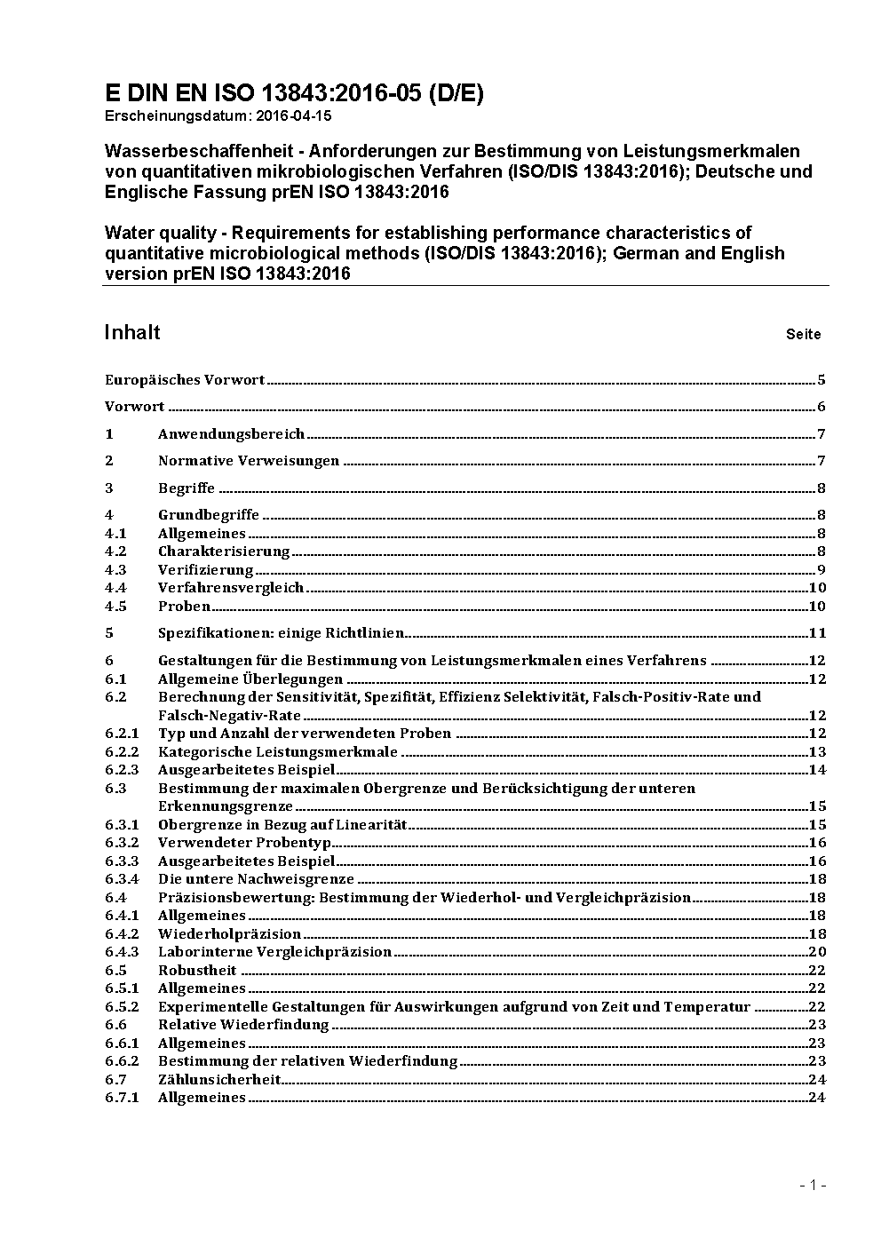 Water quality - Requirements for establishing performance characteristics of quantitative microbiological methods (ISO/DIS 13843:2016); German and English version prEN ISO 13843:2016