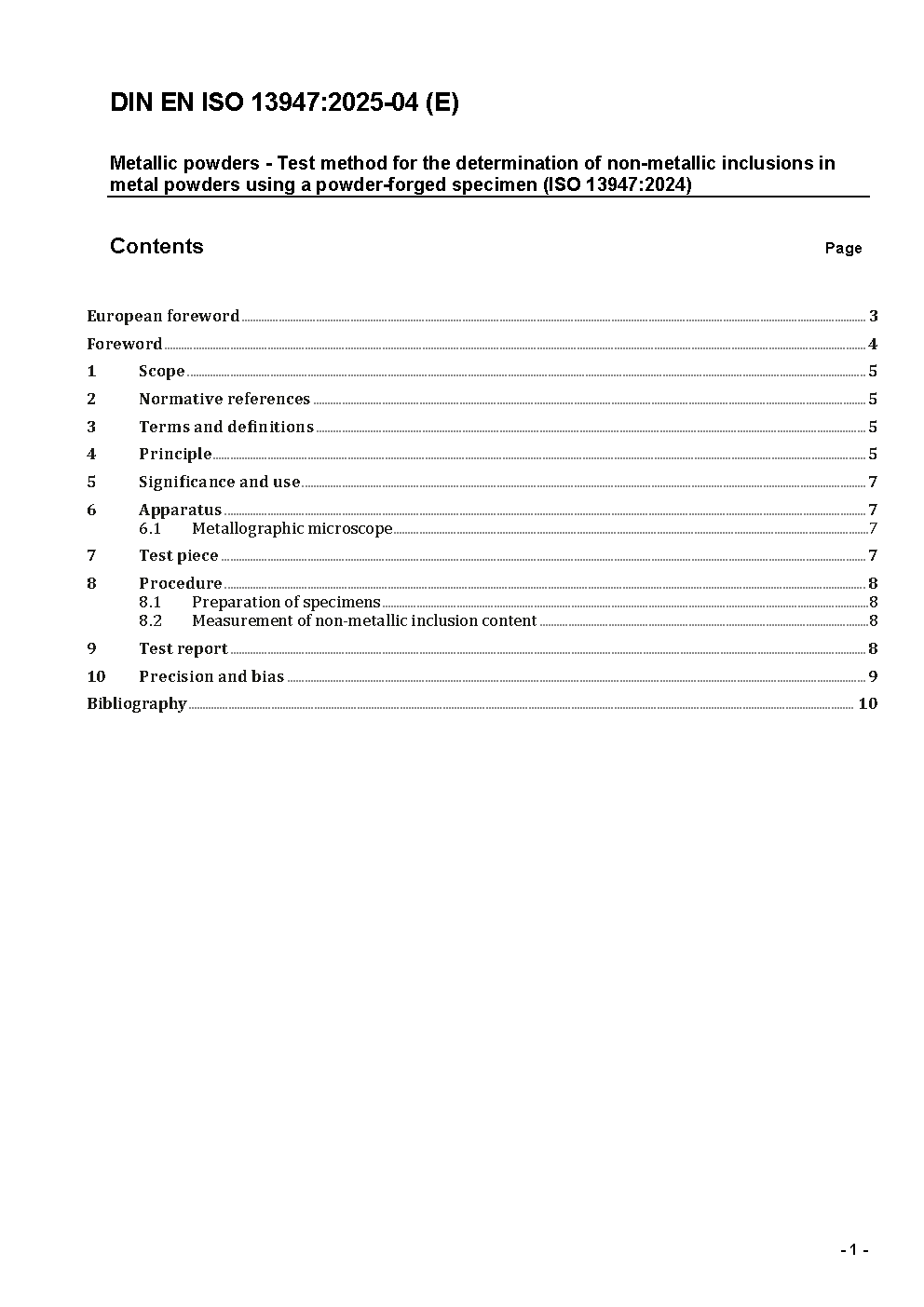Metallic powders - Test method for the determination of non-metallic inclusions in metal powders using a powder-forged specimen (ISO/DIS 13947:2023); German and English version prEN ISO 13947:2023