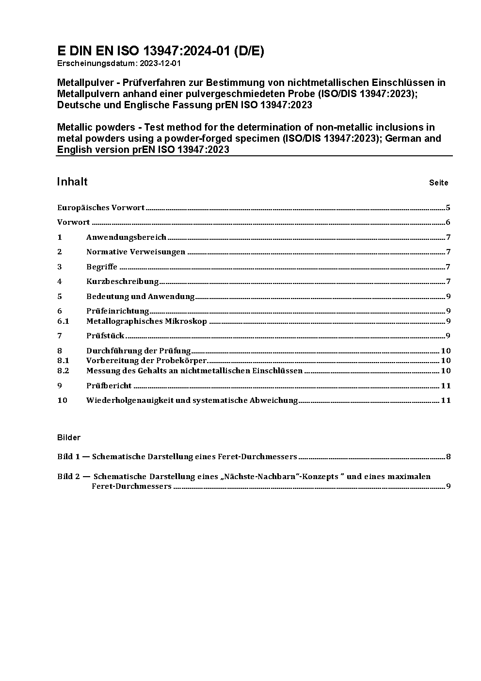 Metallpulver - Prüfverfahren zur Bestimmung von nichtmetallischen Einschlüssen in Metallpulvern anhand einer pulvergeschmiedeten Probe (ISO/DIS 13947:2023); Deutsche und Englische Fassung prEN ISO 13947:2023
