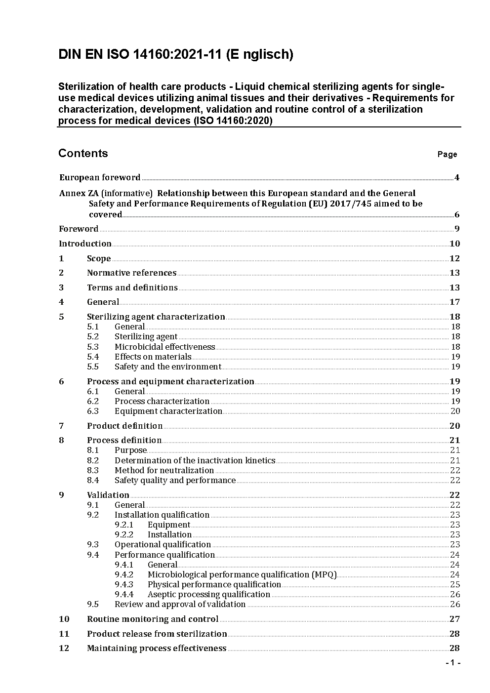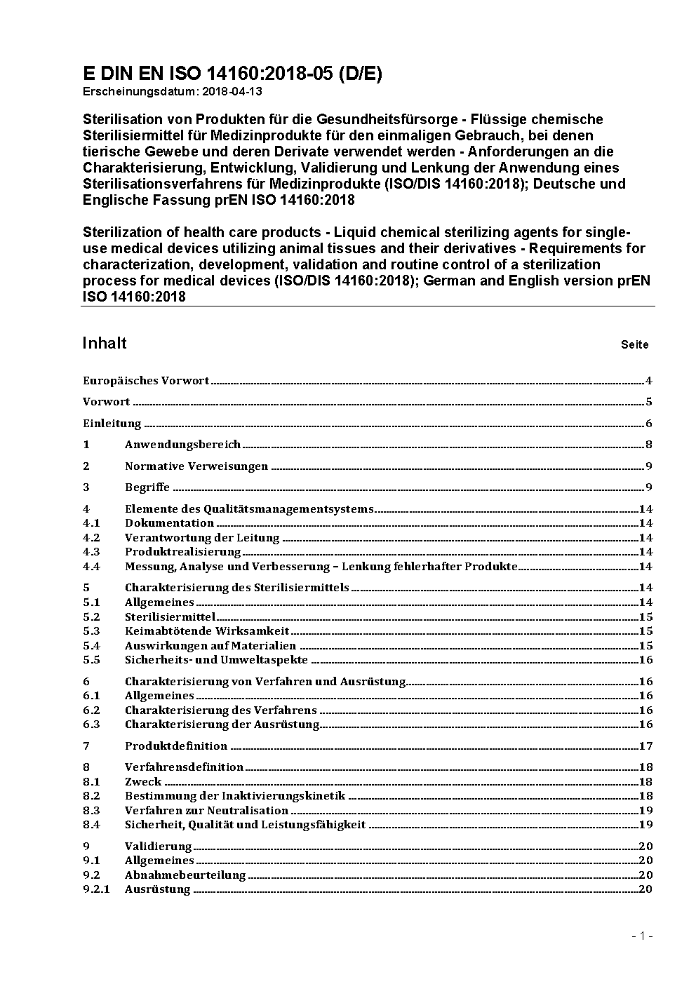 Sterilization of single-use medical devices incorporating materials of animal origin - Validation and routine control of sterilization by liquid chemical sterilants (ISO 14160:1998); German version EN ISO 14160:1998