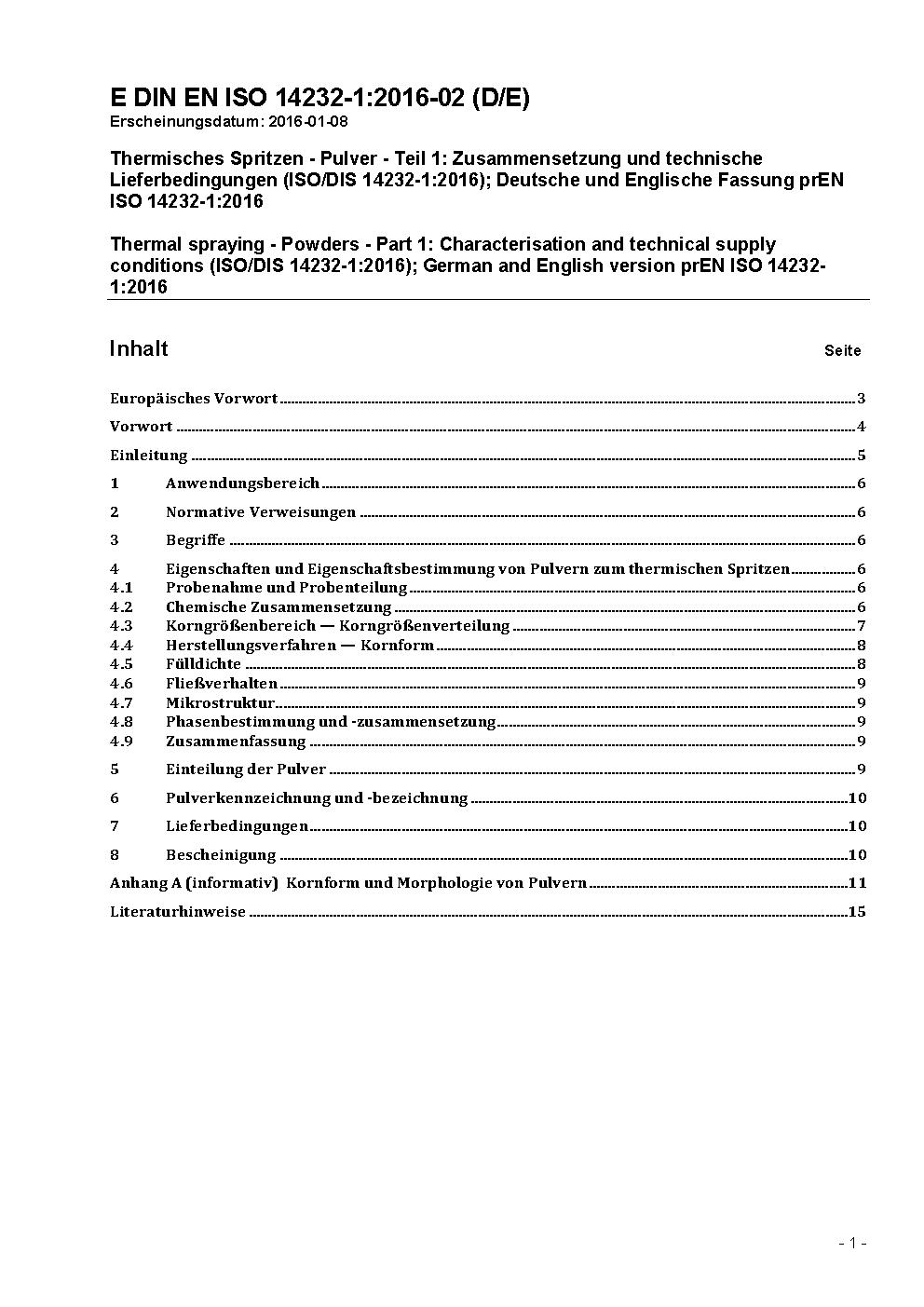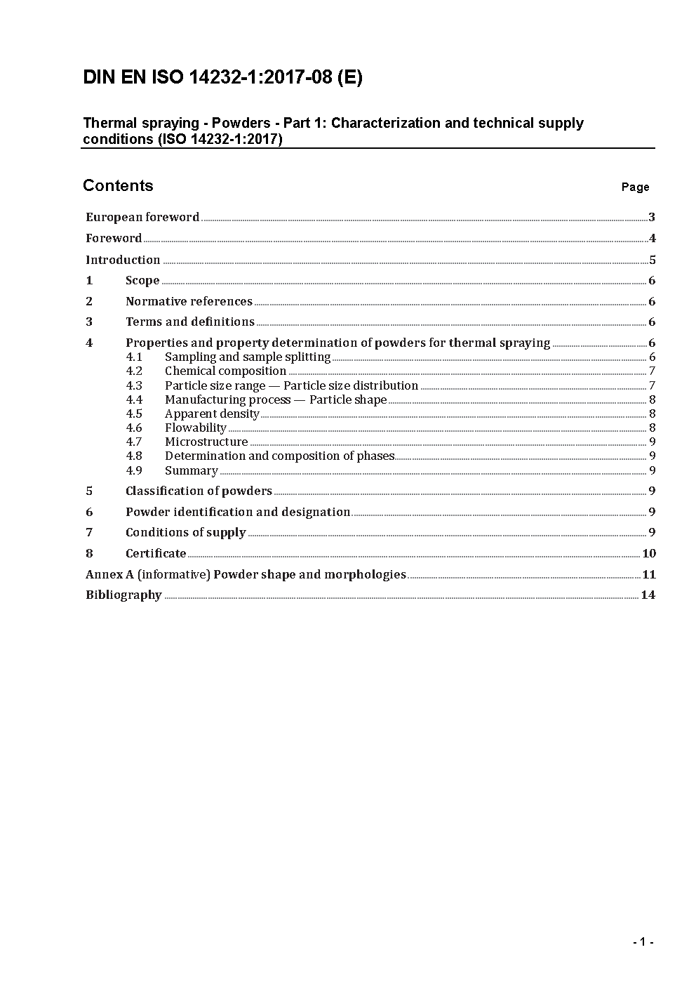 Thermal spraying - Powders - Part 1: Characterization and technical supply conditions (ISO 14232-1:2017); German version EN ISO 14232-1:2017
