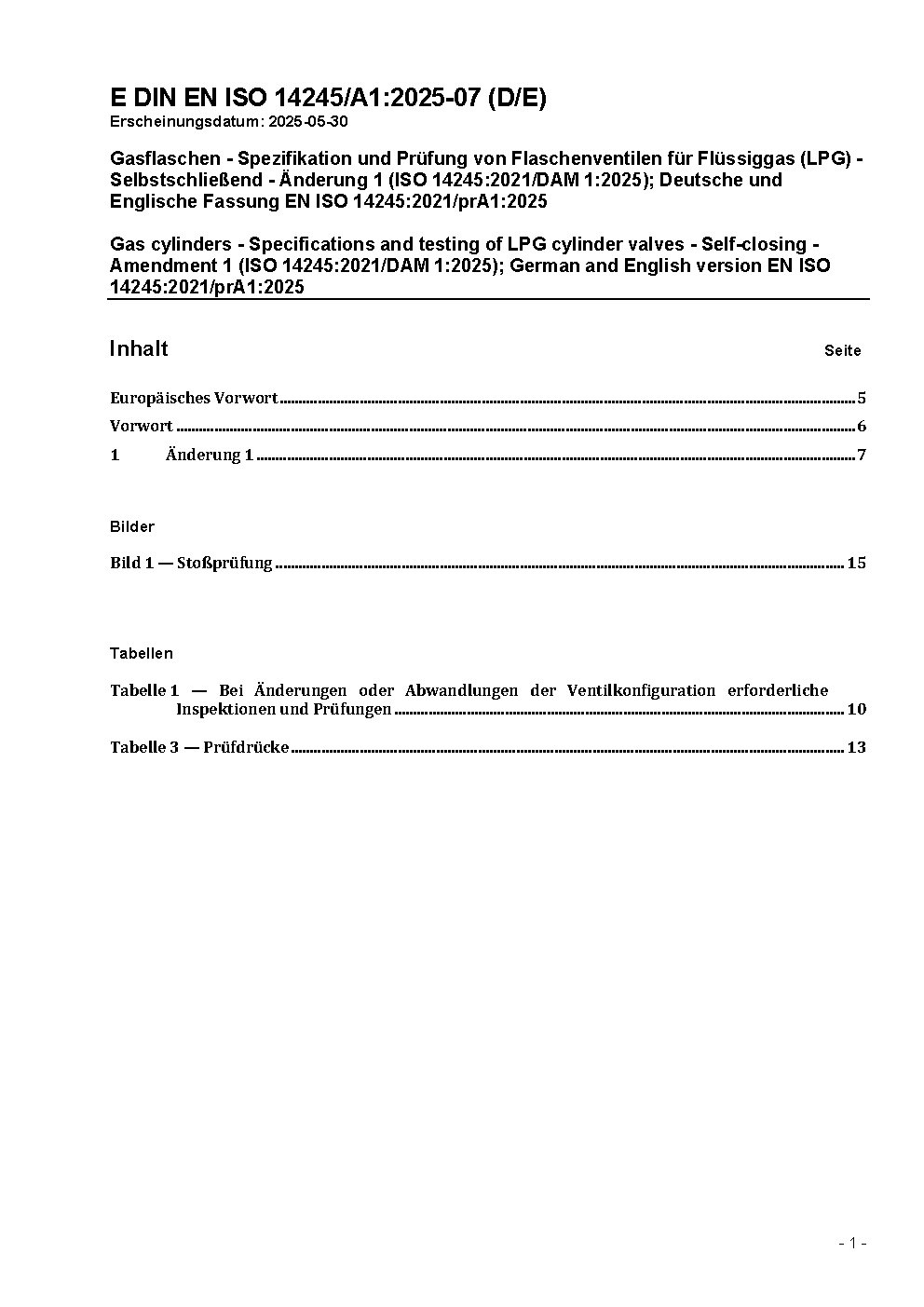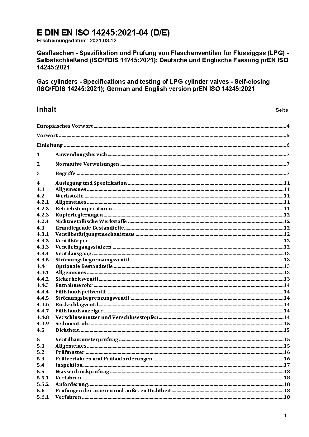 Gasflaschen - Spezifikation und Prüfung von Flaschenventilen für Flüssiggas (LPG) - Selbstschließend (ISO 14245:2006); Deutsche Fassung FprEN ISO 14245:2009