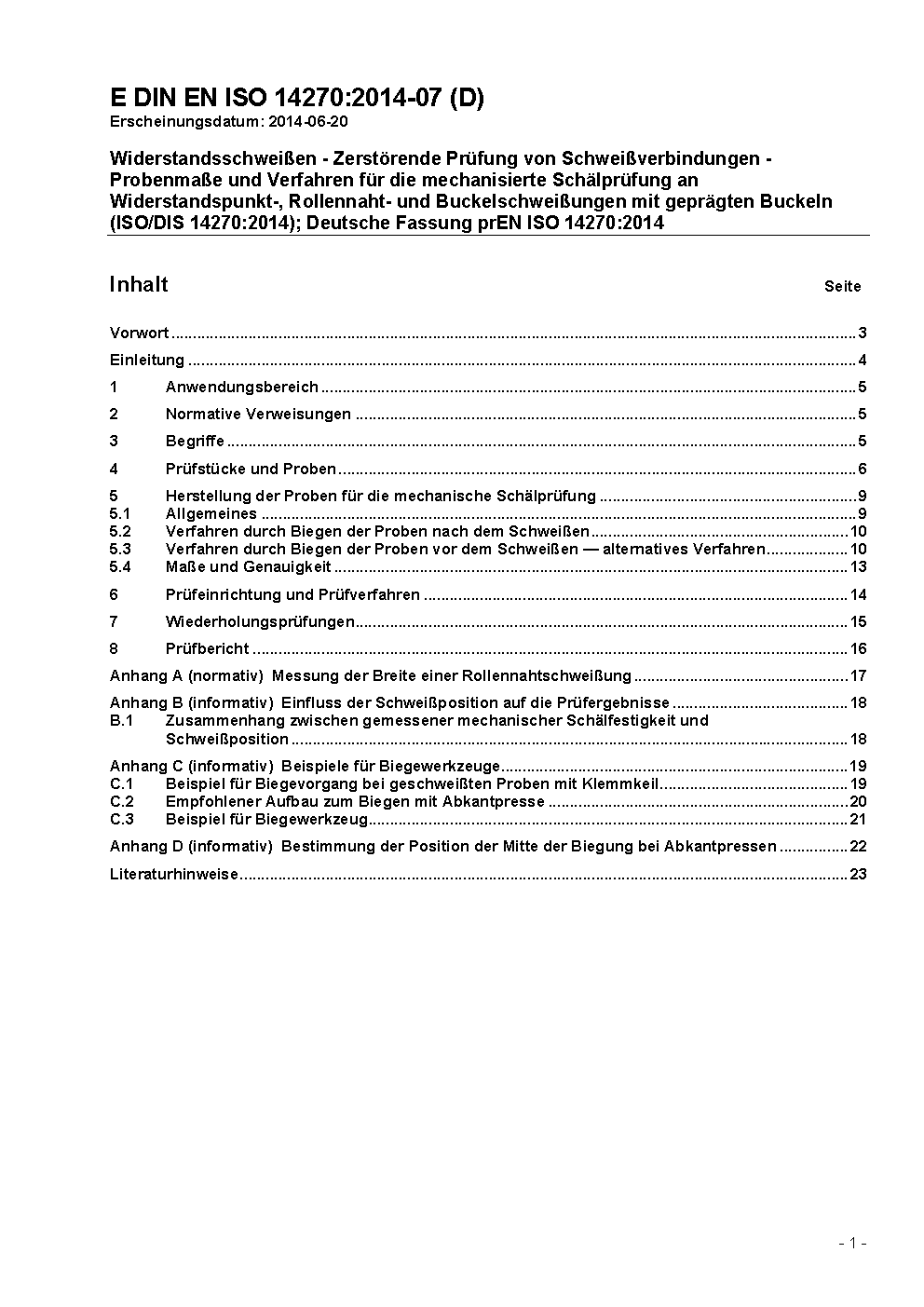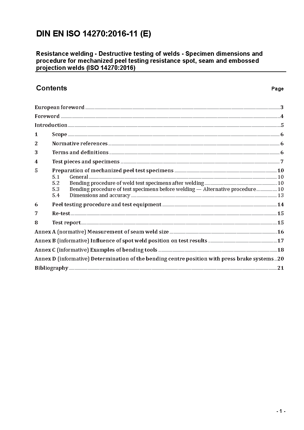 Resistance welding - Destructive testing of welds - Specimen dimensions and procedure for mechanized peel testing resistance spot, seam and embossed projection welds (ISO 14270:2016); German version EN ISO 14270:2016