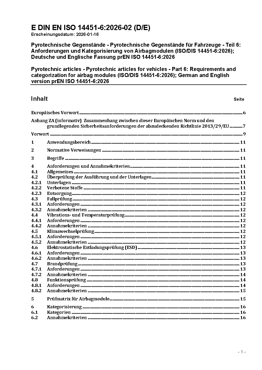 Pyrotechnische Gegenstände - Pyrotechnische Gegenstände für Fahrzeuge - Teil 6: Anforderungen an Airbagmodule (ISO/DIS 14451-6:2011); Deutsche Fassung prEN ISO 14451-6:2011