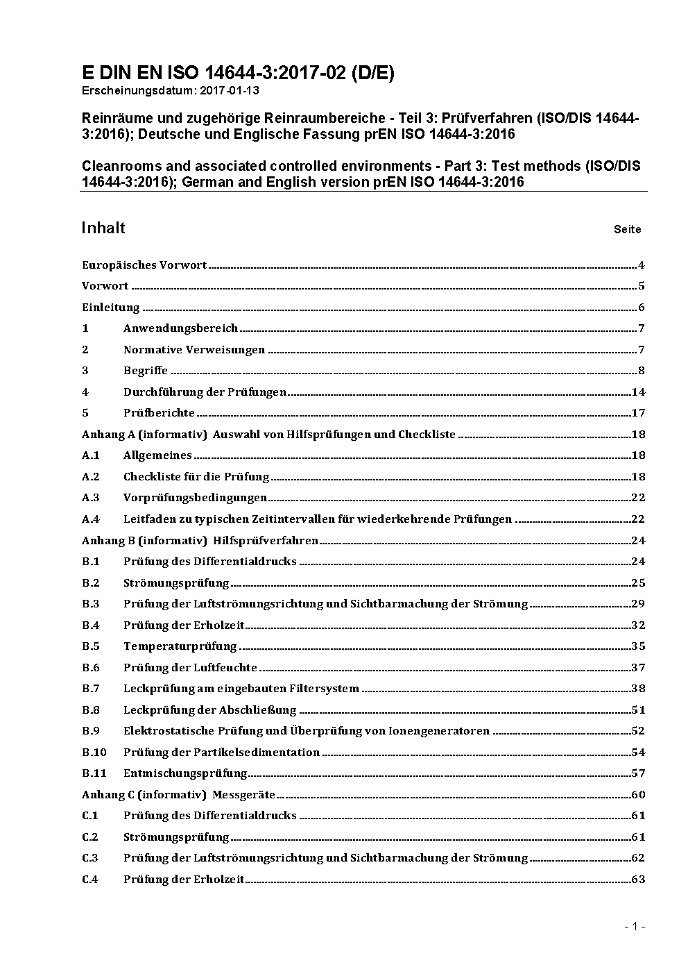 Cleanrooms and associated controlled environments - Part 3: Test methods (ISO/DIS 14644-3:2016); German and English version prEN ISO 14644-3:2016