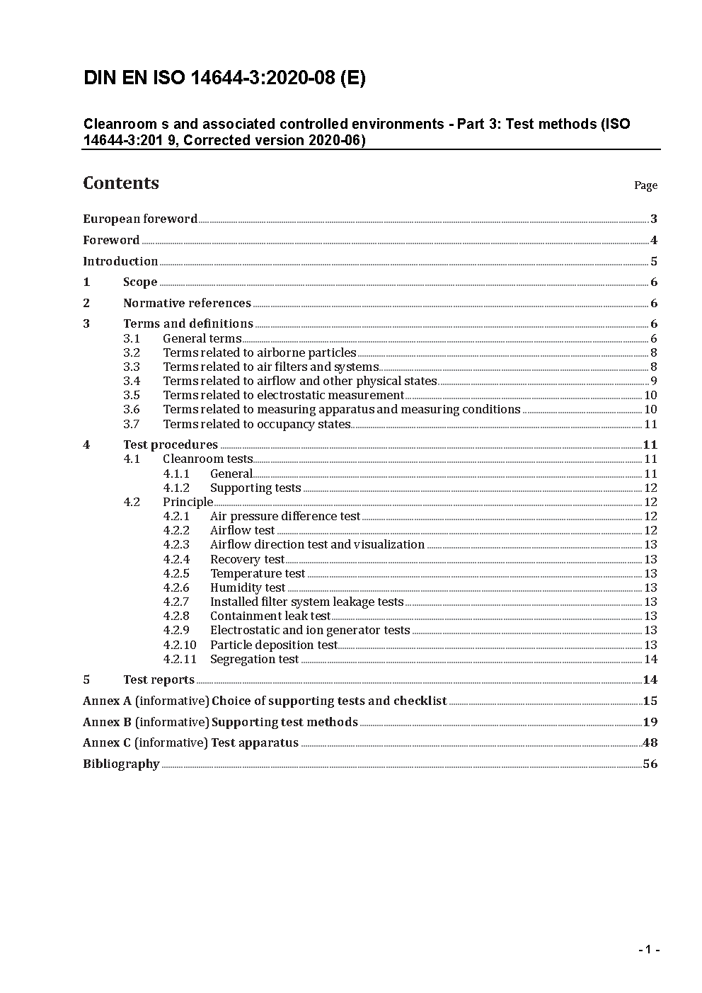 This standard specifies metrology and test methods for characterizing the performance of cleanrooms (with unidirectional or non-unidirectional flow) and clean zones in three possible occupancy states (as-built, at-rest and operational). The test methods recommend test equipment requirements and testing procedures for determining performance parameters. Where the test method is affected by the type of cleanroom, alternative procedures are defined. For some tests, several different methods and instruments are recommended. The test methods also may be used or adopted for requalification or for periodic monitoring of the performance. Measurements on products or processes in cleanrooms are not considered.