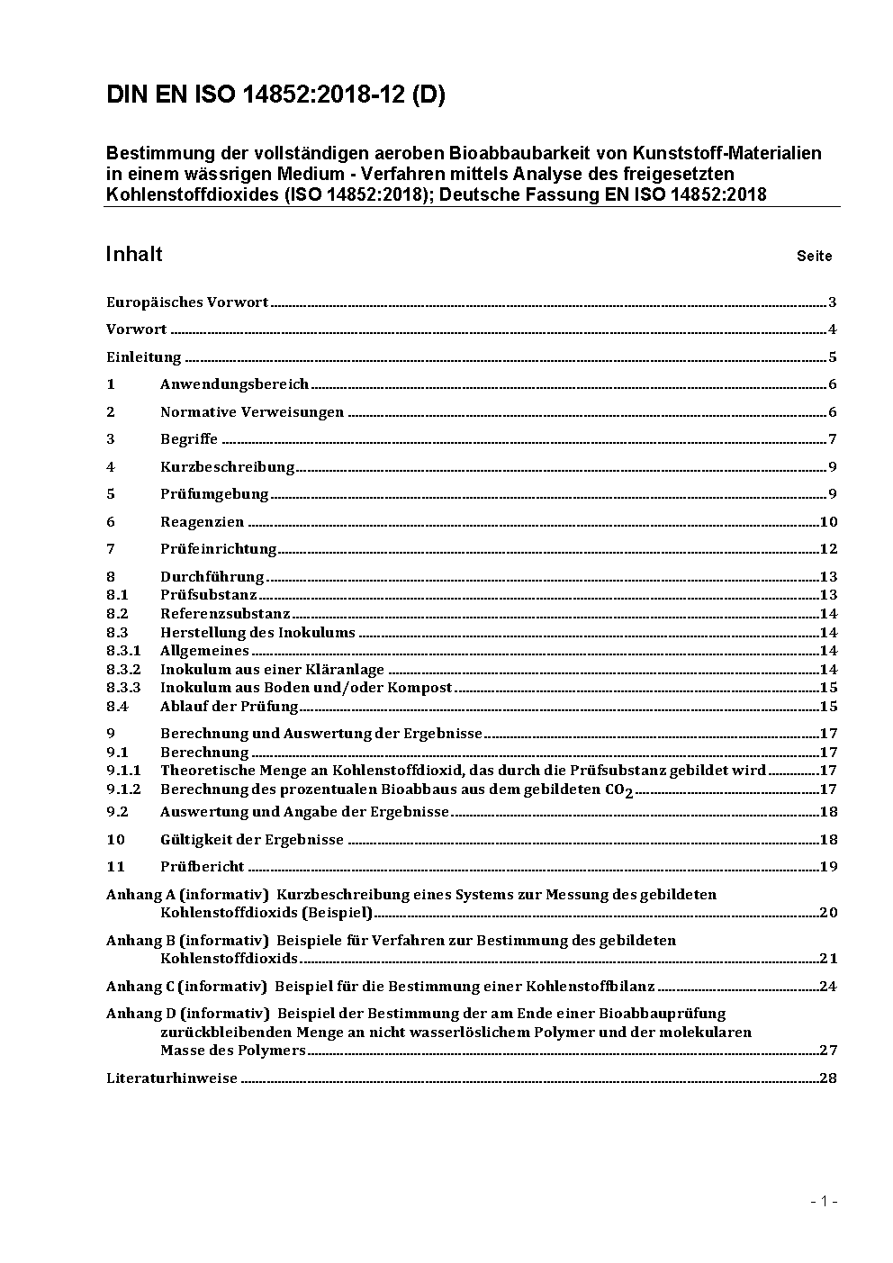 Determination of the ultimate aerobic biodegradability of plastic materials in an aqueous medium - Method by analysis of evolved carbon dioxide (ISO 14852:1999); German version EN ISO 14852:2004
