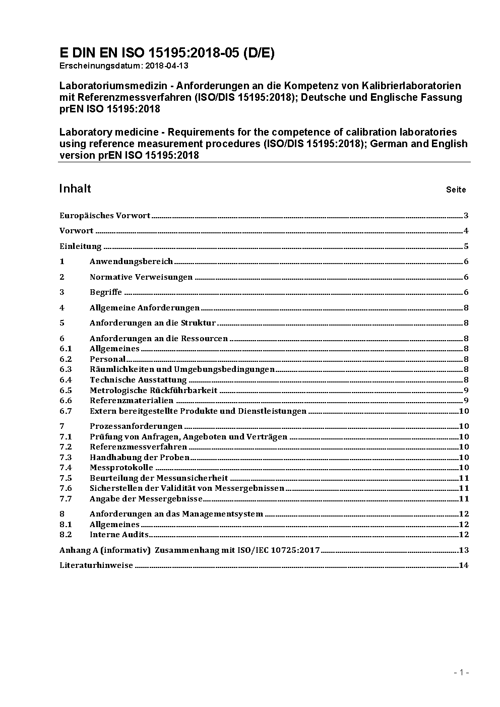 Laboratory medicine - Requirements for the competence of calibration laboratories using reference measurement procedures (ISO/DIS 15195:2018); German and English version prEN ISO 15195:2018