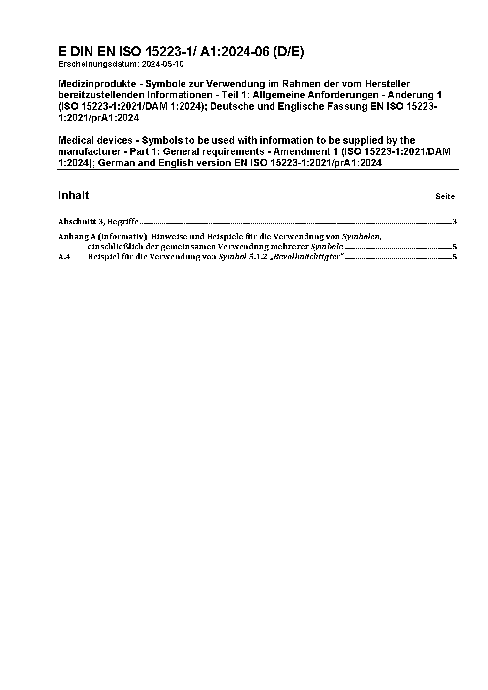 Medical devices - Symbols to be used with information to be supplied by the manufacturer - Part 1: General requirements - Amendment 1 (ISO 15223-1:2021/DAM 1:2024); German and English version EN ISO 15223-1:2021/prA1:2024