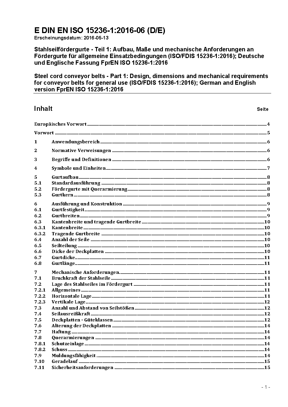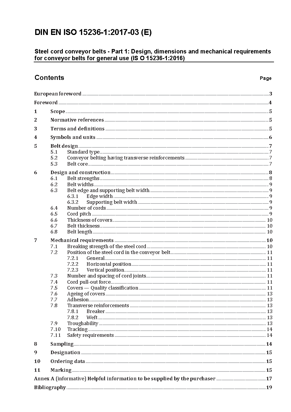 Steel cord conveyor belts - Part 1: Design, dimensions and mechanical requirements for conveyor belts for general use (ISO 15236-1:2005); German version EN ISO 15236-1:2005