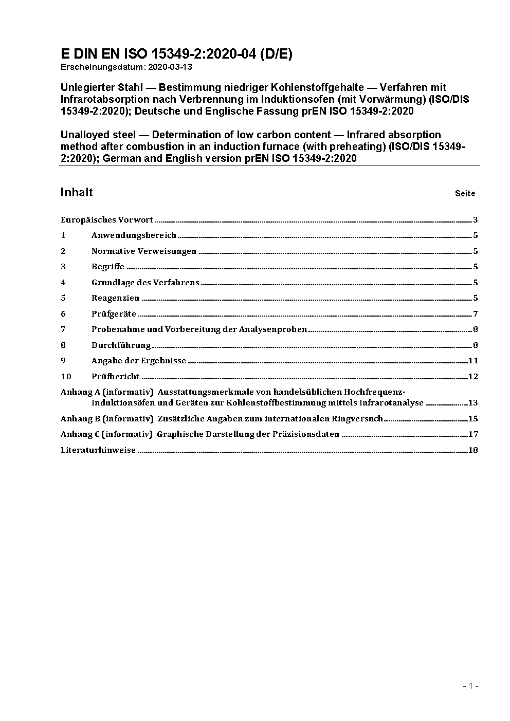 Unlegierter Stahl - Bestimmung niedriger Kohlenstoffgehalte - Verfahren mit Infrarotabsorption nach Verbrennung im Induktionsofen (mit Vorwärmung) (ISO/DIS 15349-2:2020); Deutsche und Englische Fassung prEN ISO 15349-2:2020