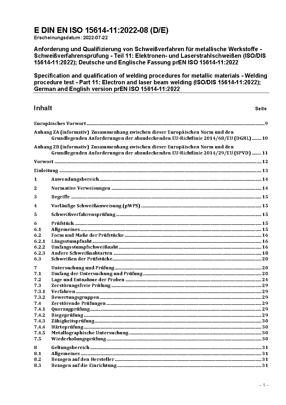 Specification and qualification of welding procedures for metallic materials - Welding procedure test - Part 11: Electron and laser beam welding (ISO 15614-11:2002); German version EN ISO 15614-11:2002