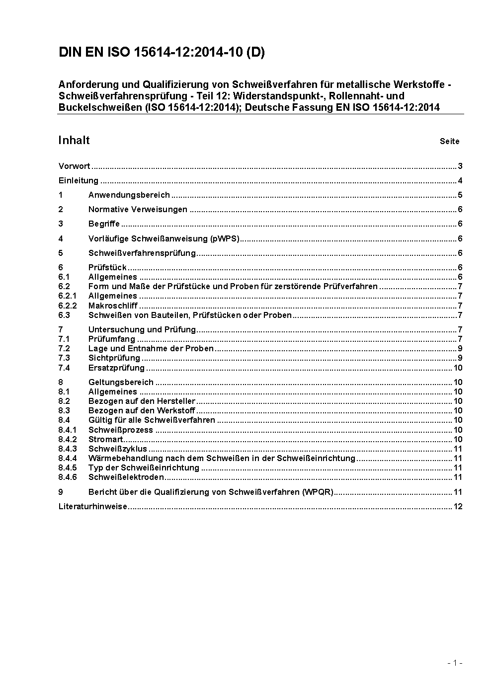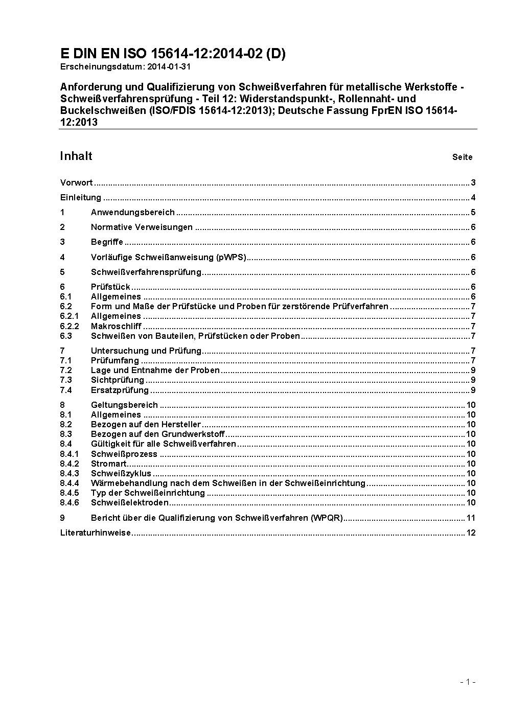 Anforderung und Anerkennung von Schweißverfahren für metallische Werkstoffe - Schweißverfahrensprüfung - Teil 12: Punkt-, Rollennaht- und Buckelschweißen (ISO/DIS 15614-12:2000); Deutsche Fassung prEN ISO 15614-12:2000