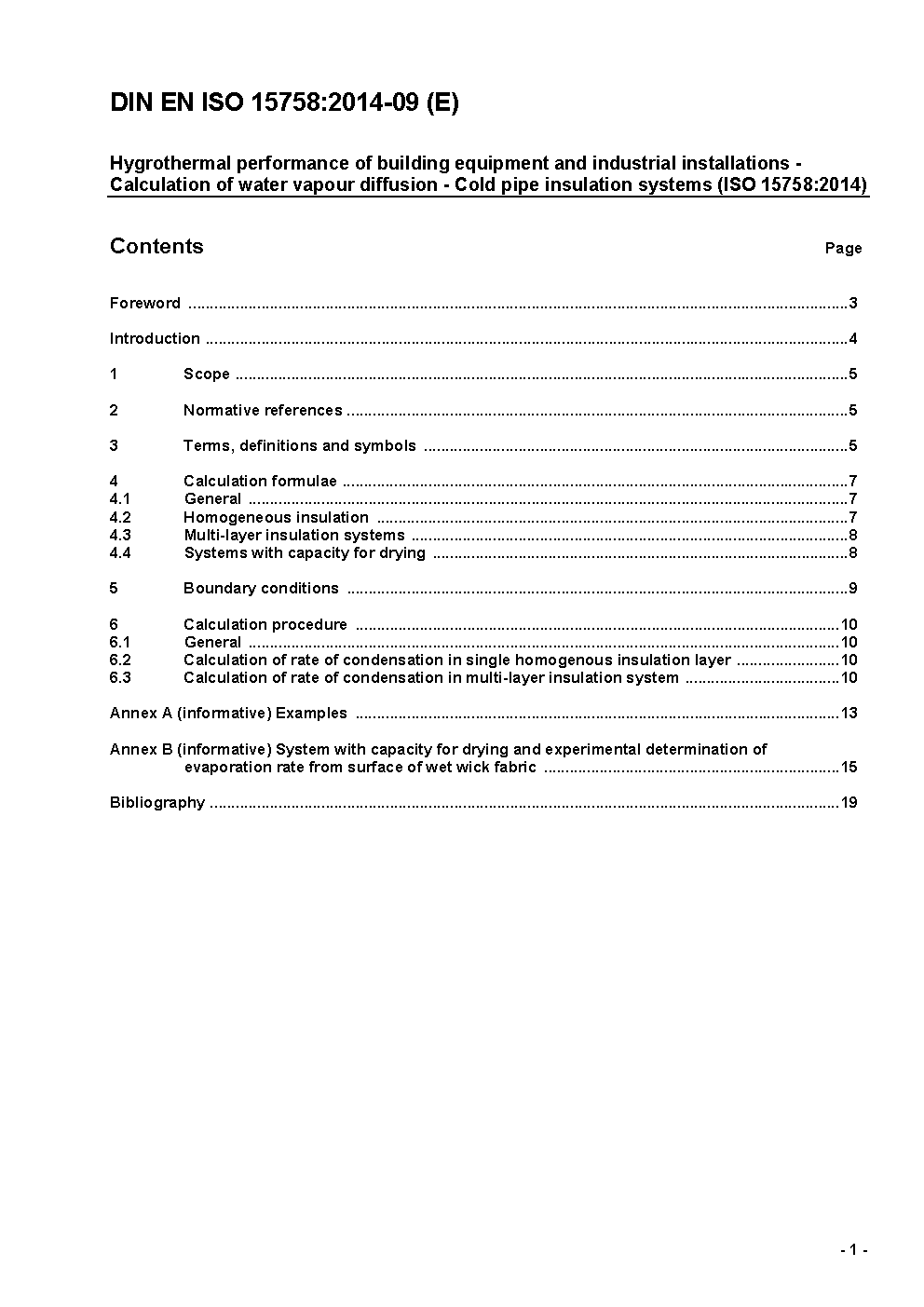 This standard specifies a method to calculate the density of water vapour flow rate in cold pipe insulation systems, and the total amount of water diffused into the insulation over time. This calculation method presupposes that water vapour can only migrate into the insulation system by diffusion, with no contribution from airflow. It also assumes the use of homogeneous, isotropic insulation materials so that the water vapour partial pressure is constant at all points equidistant from the axis of the pipe. The standard is applicable when the temperature of the medium in the pipe is above 0 °C. It applies to pipes inside buildings as well as in the open air.