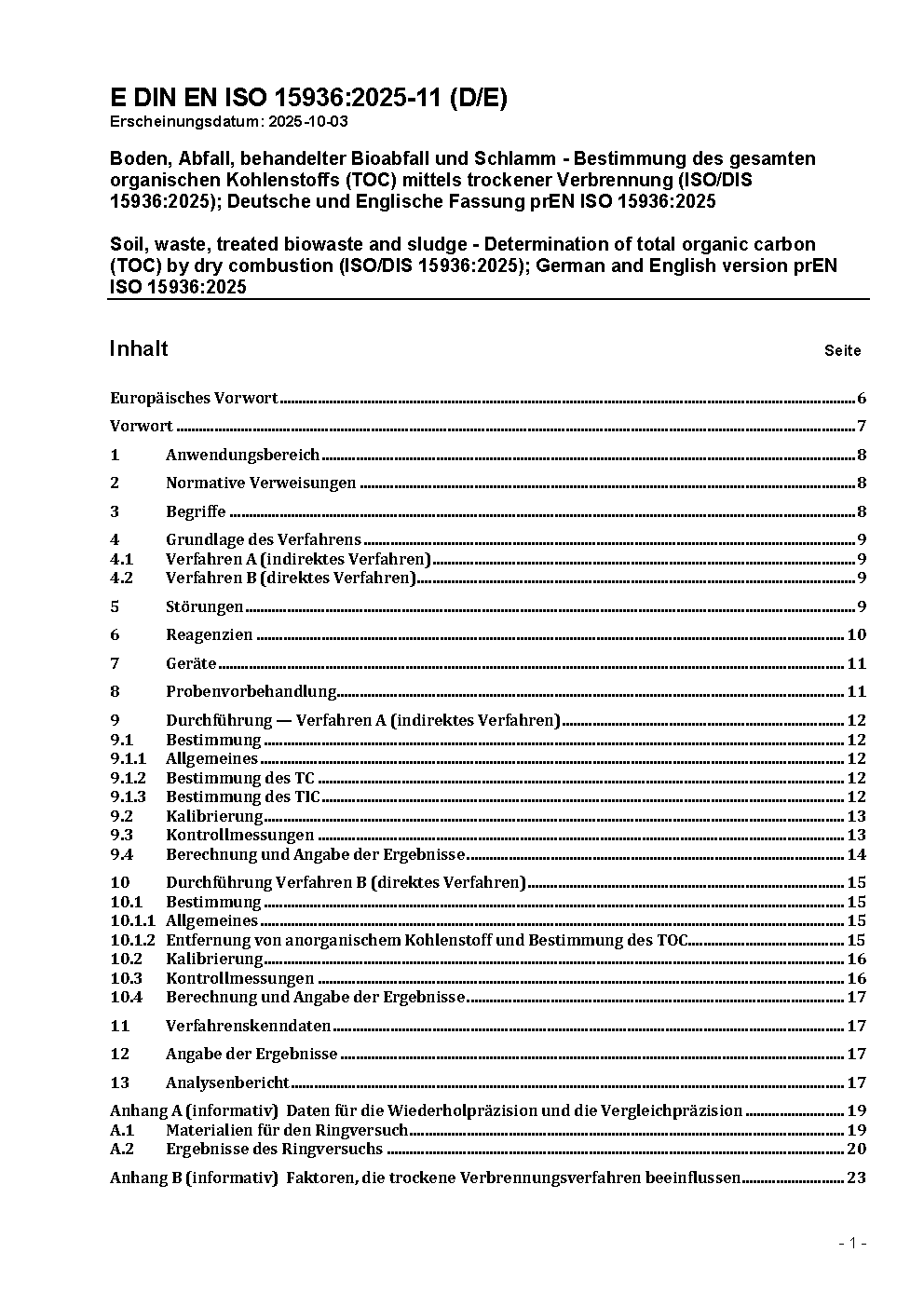 Soil, waste, treated biowaste and sludge - Determination of total organic carbon (TOC) by dry combustion (ISO/DIS 15936:2025); German and English version prEN ISO 15936:2025