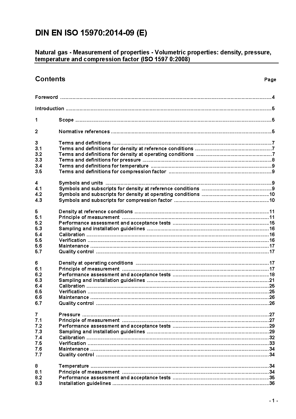 DIN EN ISO 15970 gives requirements and procedures for the measurement of the properties of natural gas that are used mainly for volume calculation and volume conversion: density at reference and at operating conditions, pressure, temperature and compression factor. Only those methods and instruments are considered that are suitable for field operation under the conditions of natural gas transmission and distribution, installed either in-line or on-line, and that do not involve the determination of the gas composition. This International Standard gives examples for currently used instruments that are available commercially and of interest to the natural gas industry.
