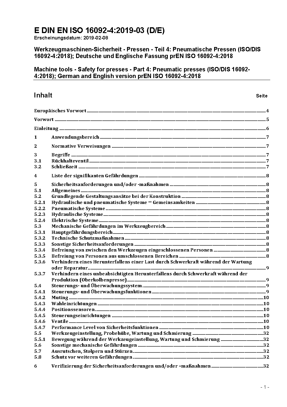 Machine tools safety - Presses - Part 4: Safety requirements for pneumatic presses (ISO 16092-4:2019); German and English version EN ISO 16092-4:2020