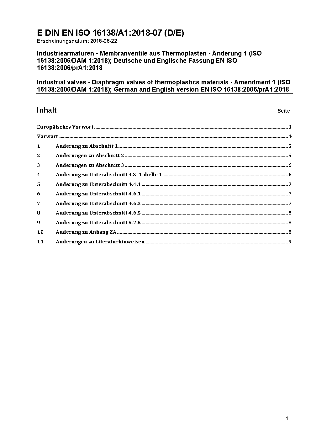 Industrial valves - Diaphragm valves of thermoplastics materials - Amendment 1 (ISO 16138:2006/DAM 1:2018); German and English version EN ISO 16138:2006/prA1:2018