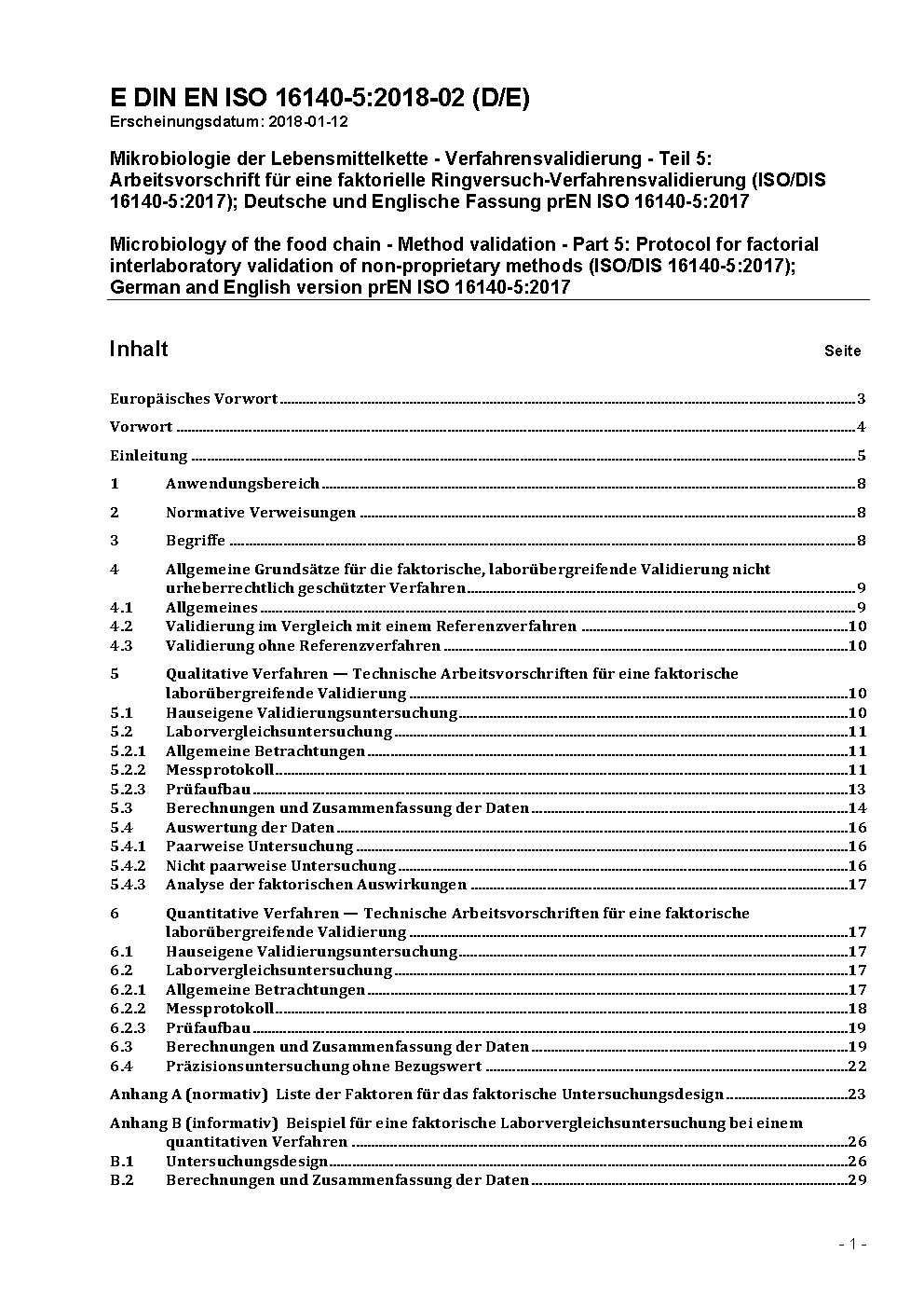 Microbiology of the food chain - Method validation - Part 5: Protocol for factorial interlaboratory validation of non-proprietary methods (ISO/DIS 16140-5:2017); German and English version prEN ISO 16140-5:2017