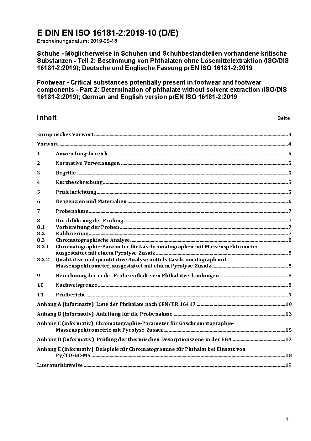 Schuhe - Möglicherweise in Schuhen und Schuhbestandteilen vorhandene kritische Substanzen - Teil 2: Bestimmung von Phthalaten ohne Lösemittelextraktion (ISO/DIS 16181-2:2019); Deutsche und Englische Fassung prEN ISO 16181-2:2019