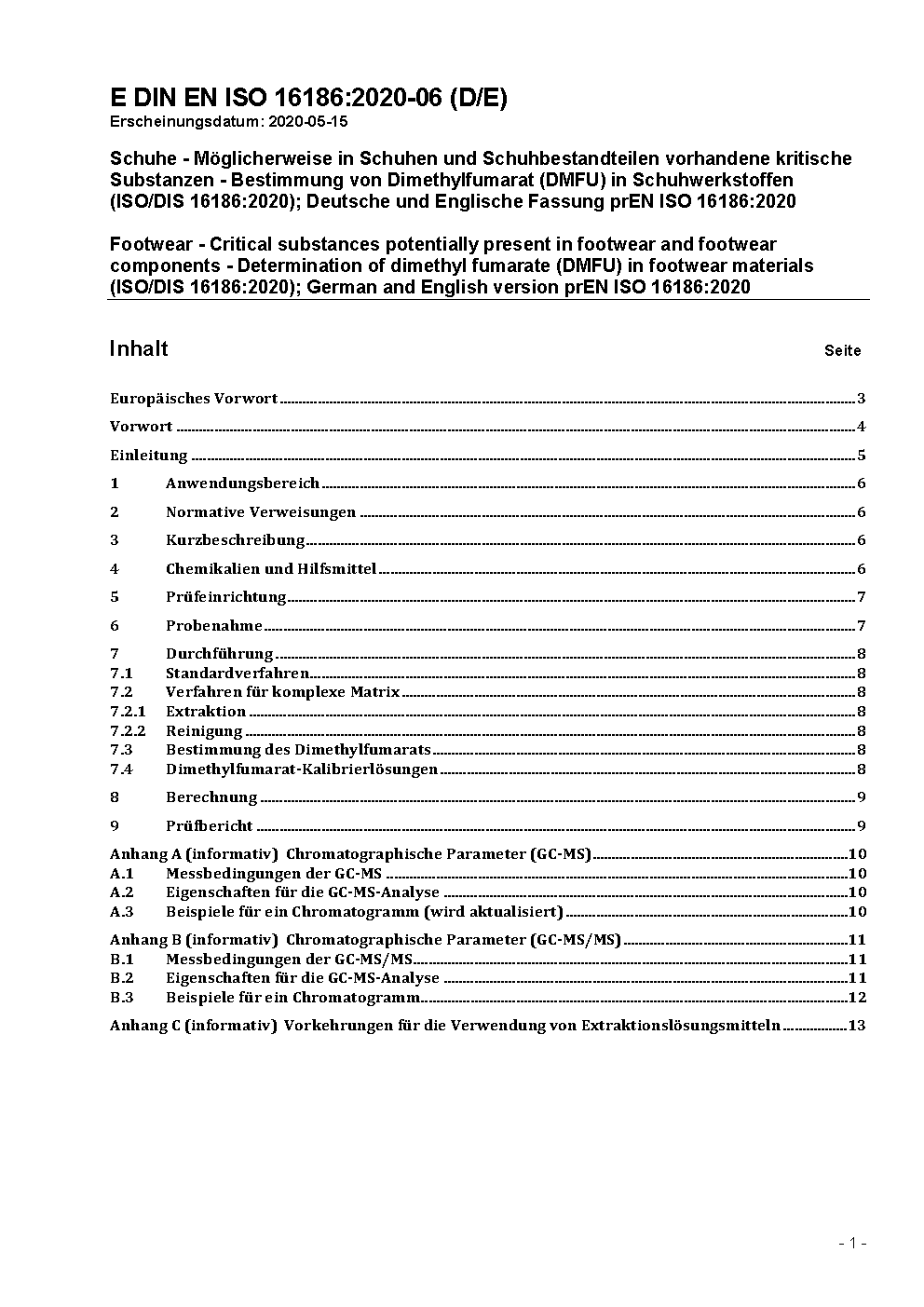 Schuhe - Möglicherweise in Schuhen und Schuhbestandteilen vorhandene kritische Substanzen - Bestimmung von Dimethylfumarat (DMFU) in Schuhwerkstoffen (ISO/DIS 16186:2020); Deutsche und Englische Fassung prEN ISO 16186:2020