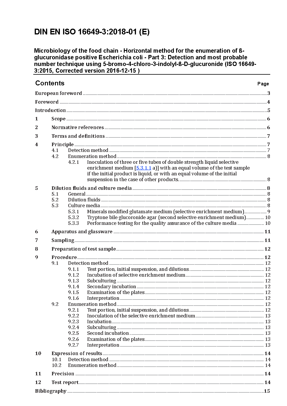 Microbiology of food and animal feeding stuffs - Enumeration of -glucuronidase-positive Escherichia coli - Part 3: Detection and most probable number technique using 5-bromo-4-chloro-3-indolyl--D-glucuronide (ISO/DIS 16649-3:2013); German version prEN ISO 16649-3:2013