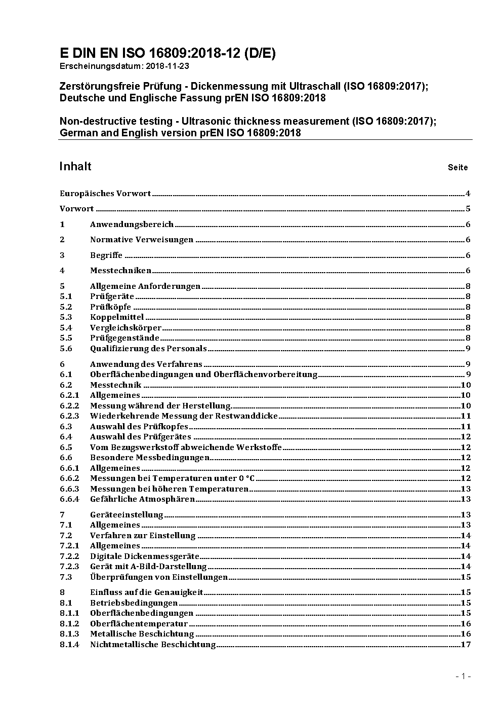 Non-destructive testing - Ultrasonic thickness measurement (ISO 16809:2017); German and English version prEN ISO 16809:2018