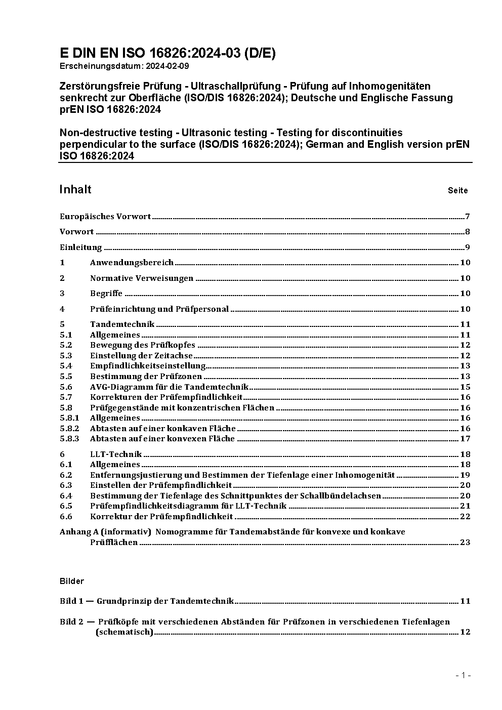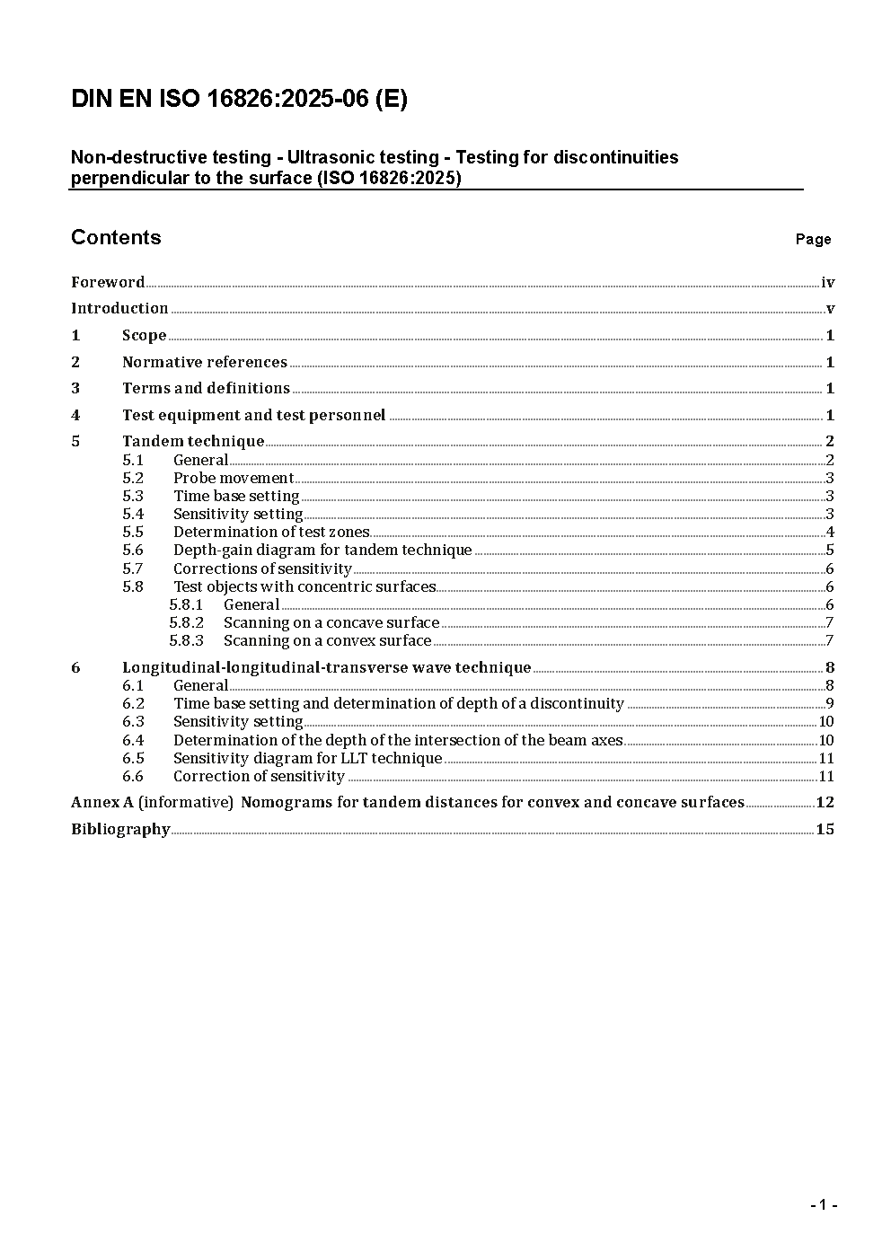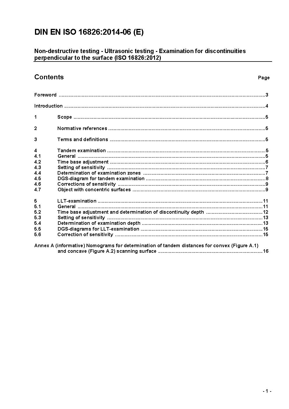 ISO 16826:2012 defines the principles for tandem? and longitudinal-longitudinal-transverse (LLT) wave?examination for the detection of discontinuities perpendicular to the surface.The general principles required for the ultrasonic examination of industrial products are described in ISO 16810. A list of symbols and equations is given in ISO 16811.The tandem? or LLT?examination should be used for the detection of planar discontinuities with distance to the surface greater than 15 mm. ISO 16826:2012 has been prepared for the examination of metallic materials with a thickness between 40 mm and 500 mm with parallel or concentric surfaces. It can, however, be used for other materials and smaller thickness provided special measures are taken.