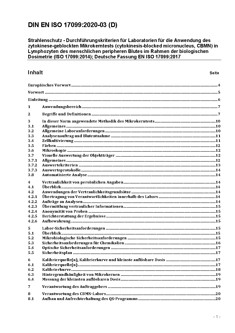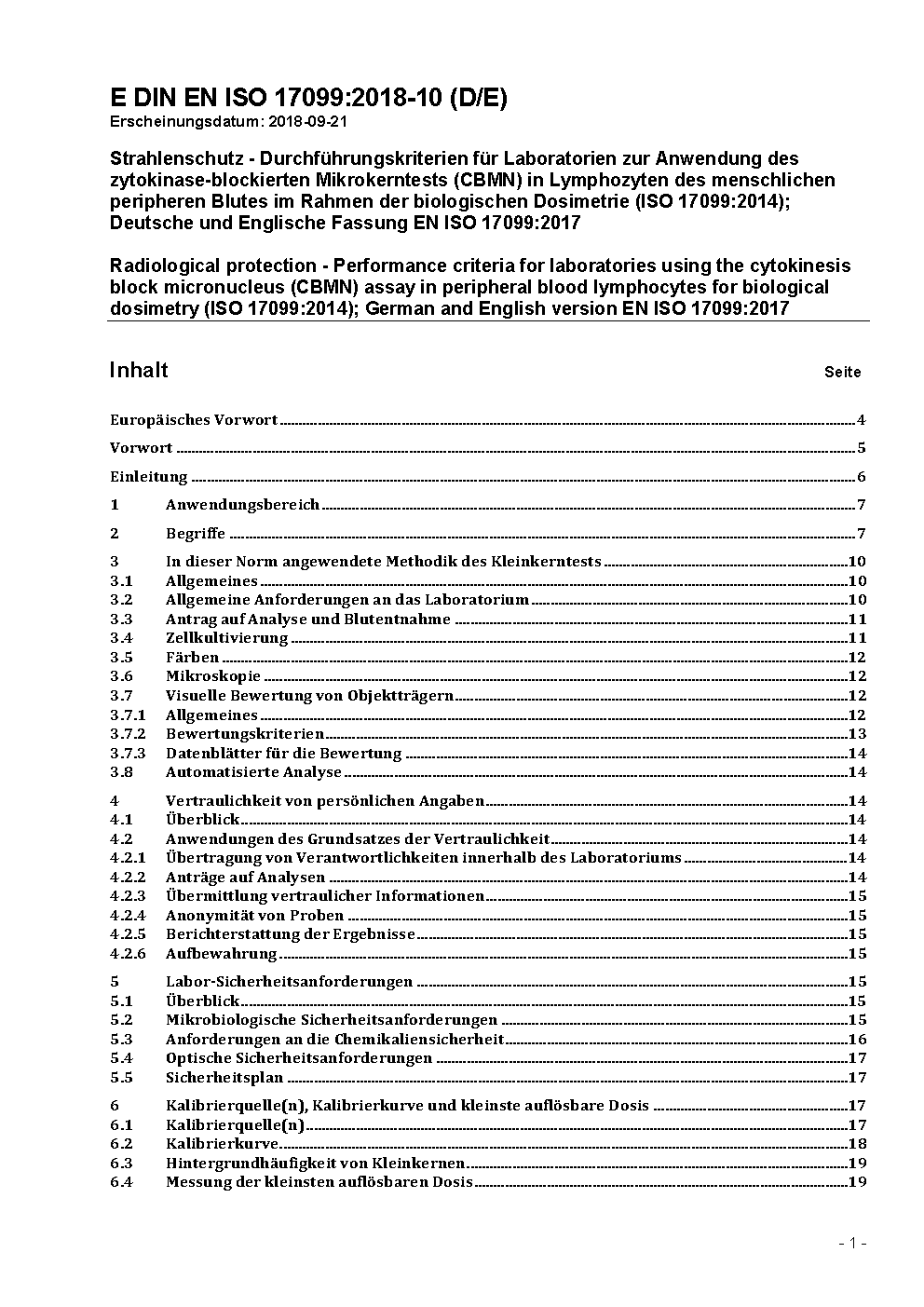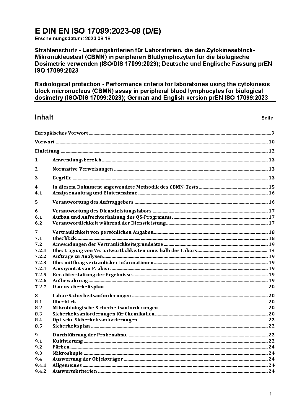 Strahlenschutz - Leistungskriterien für Laboratorien, die den Zytokinese-Block-Mikrokerntest (CBMN) in peripheren Blutlymphozyten für die biologische Dosimetrie verwenden (ISO 17099:2024); Deutsche Fassung EN ISO 17099:2024
