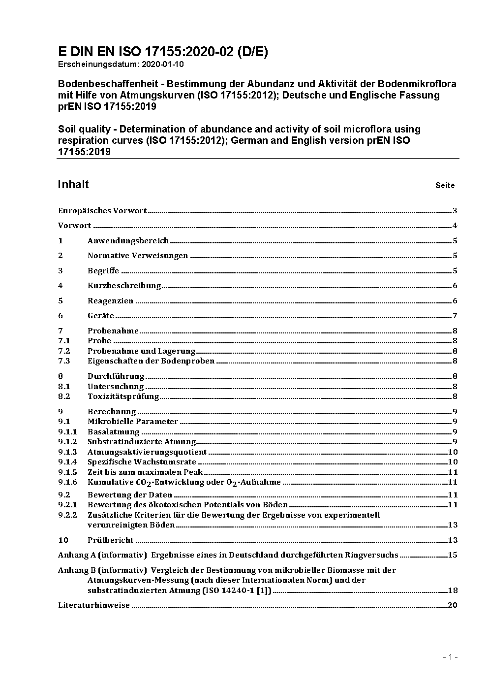Bodenbeschaffenheit - Bestimmung der Abundanz und Aktivität der Bodenmikroflora mit Hilfe von Atmungskurven (ISO 17155:2012); Deutsche Fassung EN ISO 17155:2020