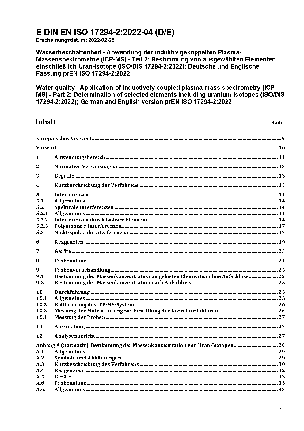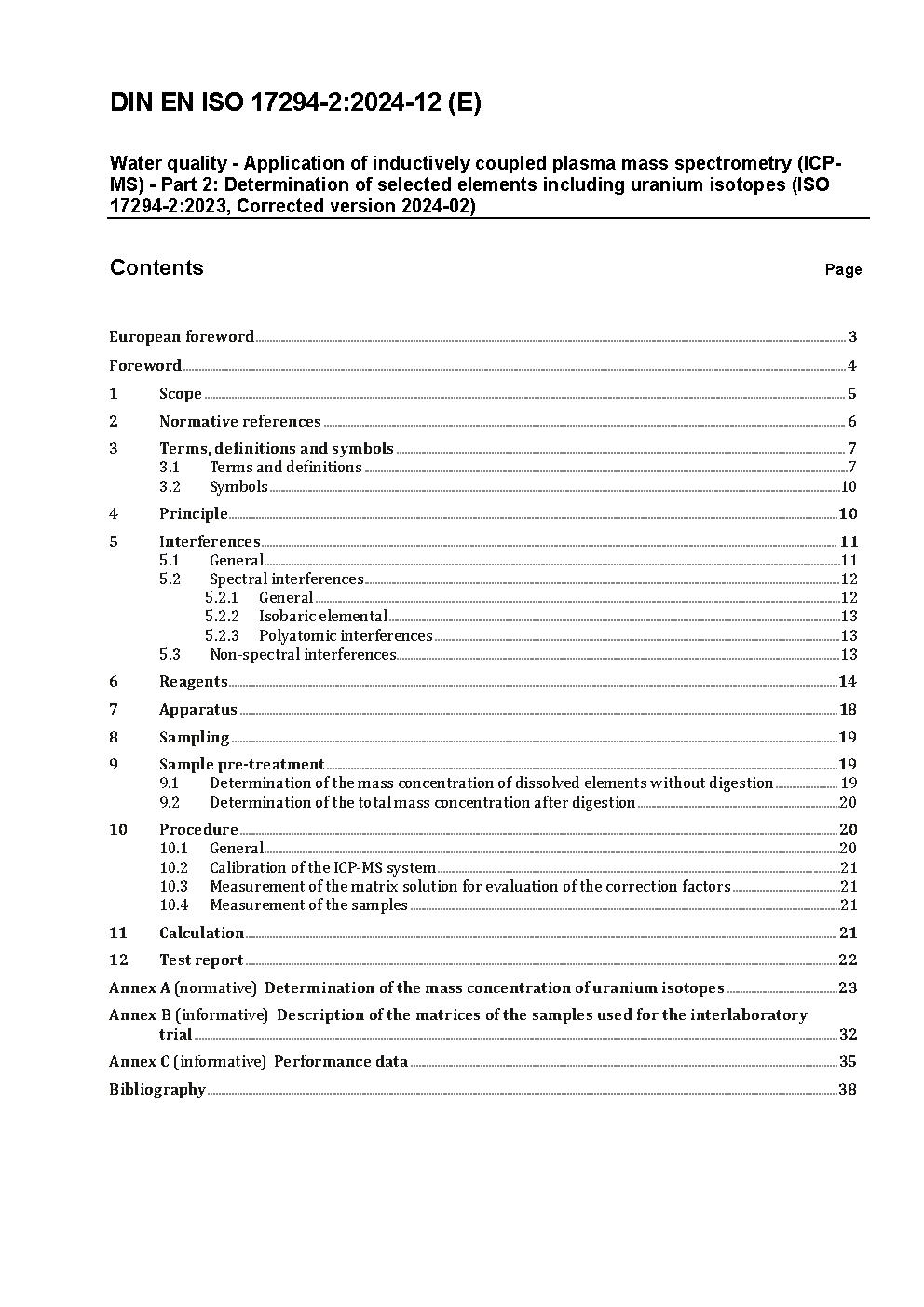 This document specifies a method for the determination of the elements aluminium, antimony, arsenic, barium, beryllium, bismuth, boron, cadmium, caesium, calcium, cerium, chromium, cobalt, copper, dysprosium, erbium, europium, gadolinium, gallium, germanium, gold, hafnium, holmium, indium, iridium, lanthanum, lead, lithium, lutetium, magnesium, manganese, molybdenum, neodymium, nickel, palladium, phosphorus, platinum, potassium, praseodymium, rubidium, rhenium, rhodium, ruthenium, samarium, scandium, selenium, silver, sodium, strontium, terbium, tellurium, thorium, thallium, thulium, tin, tungsten, uranium and its isotopes, vanadium, yttrium, ytterbium, zinc, and in water [for example drinking water, surface water, ground water, waste water and eluates]. Taking into account the specific and additionally occurring interferences, these elements can also be determined in digests of water, sludges and sediments (for example digests of water as specified in ISO 15587-1 or ISO 15587-2). The working range depends on the matrix and the interferences encountered. In drinking water and relatively unpolluted waters, the lower limit of application is between 0,01 µg/l and 1,0 µg/l for most elements. The working range typically covers concentrations between several pg/l and mg/l depending on the element and pre-defined requirements.