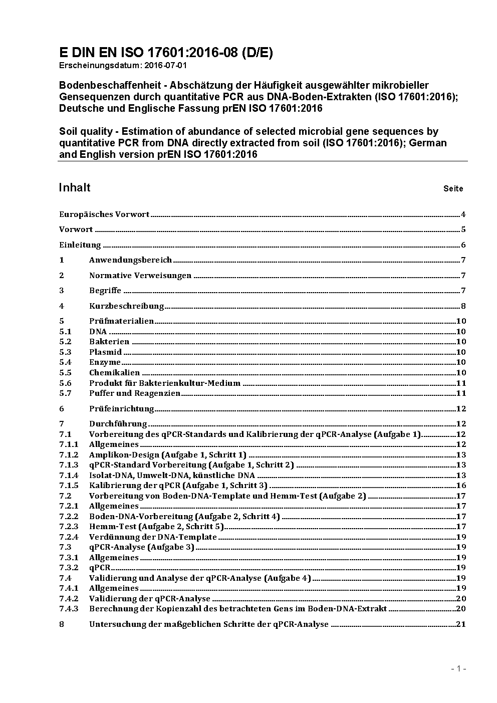 Bodenbeschaffenheit - Ermittlung der Häufigkeit ausgewählter mikrobieller Gensequenzen durch quantitative PCR aus DNA-Boden-Extrakten (ISO/DIS 17601:2024); Deutsche und Englische Fassung prEN ISO 17601:2024