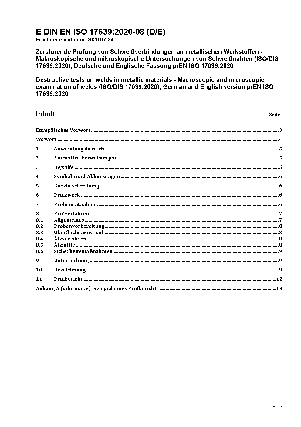 Destructive tests on welds in metallic materials - Macroscopic and microscopic examination of welds (ISO 17639:2003); German version FprEN ISO 17639:2013