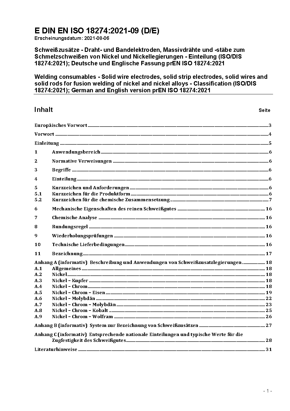 Schweißzusätze - Massivdrähte, -bänder und -stäbe zum Schmelzschweißen von Nickel und Nickellegierungen - Einteilung (ISO 18274:2004); Deutsche Fassung EN ISO 18274:2004