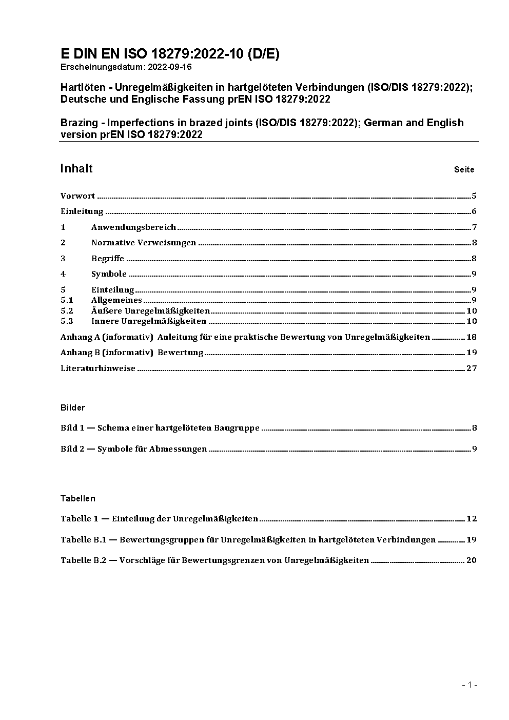 Hartlöten - Unregelmäßigkeiten in hartgelöteten Verbindungen (ISO/DIS 18279:2022); Deutsche und Englische Fassung prEN ISO 18279:2022