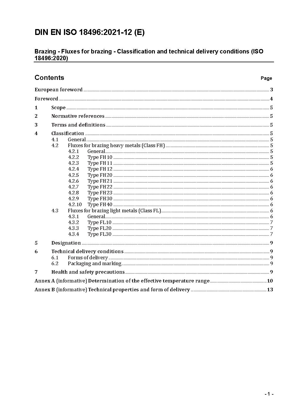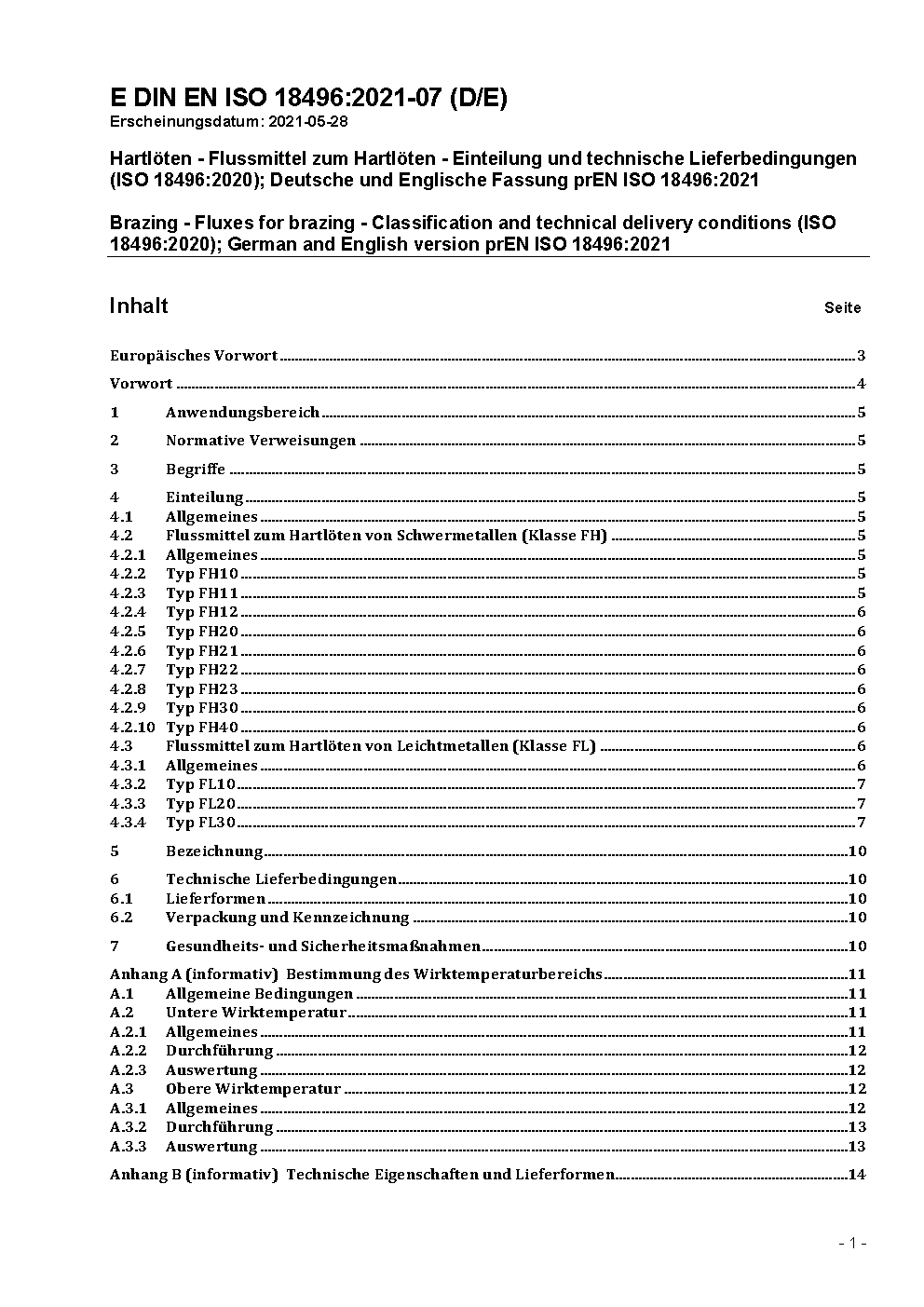 Brazing - Fluxes for brazing - Classification and technical delivery conditions (ISO 18496:2020); German and English version prEN ISO 18496:2021