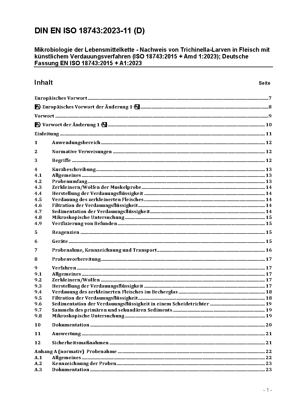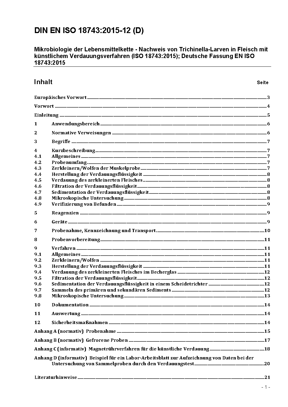Microbiology of the food chain - Detection of Trichinella larvae in meat by artificial digestion method (ISO 18743:2015); German version EN ISO 18743:2015