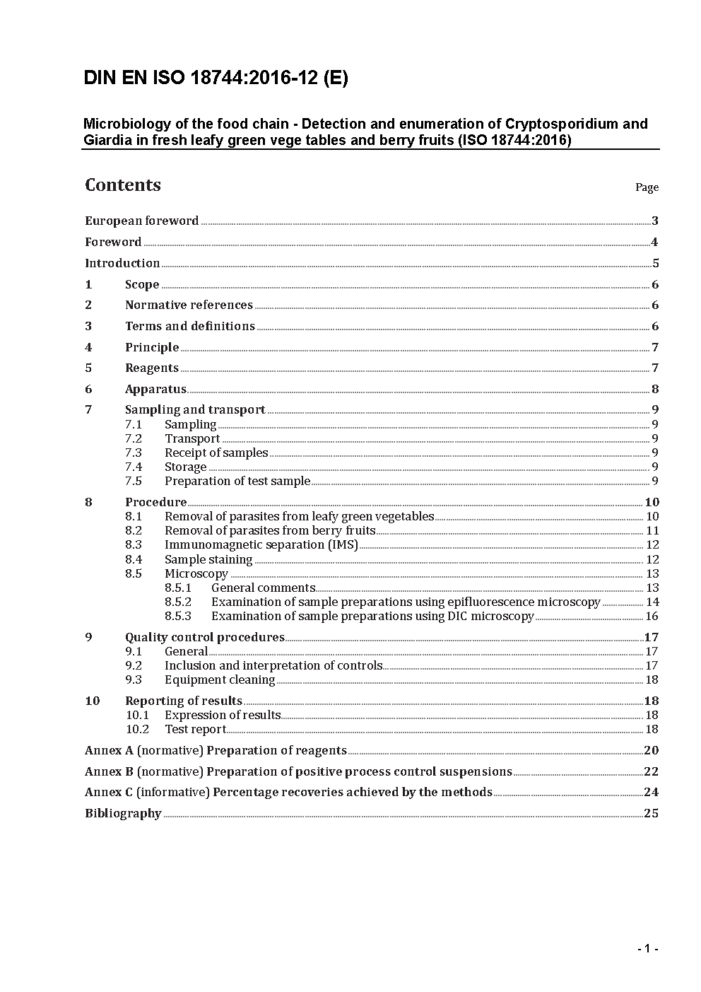 Microbiology of the food chain - Detection and enumeration of Cryptosporidium and Giardia in fresh leafy green vegetables and berry fruits (ISO 18744:2016); German version EN ISO 18744:2016