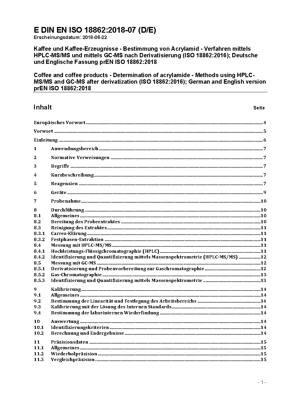 Coffee and coffee products - Determination of acrylamide - Methods using HPLC-MS/MS and GC-MS after derivatization (ISO 18862:2016); German and English version prEN ISO 18862:2018