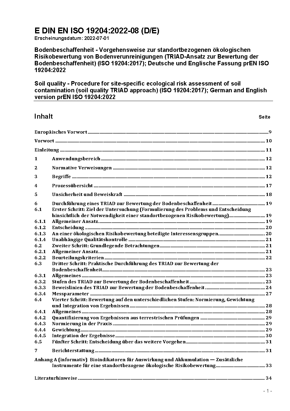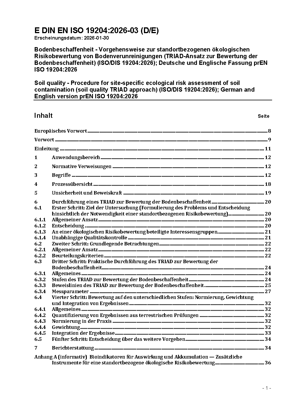 Bodenbeschaffenheit - Vorgehensweise zur standortbezogenen ökologischen Risikobewertung von Bodenverunreinigungen (TRIAD-Ansatz zur Bewertung der Bodenbeschaffenheit) (ISO/DIS 19204:2026); Deutsche und Englische Fassung prEN ISO 19204:2026
