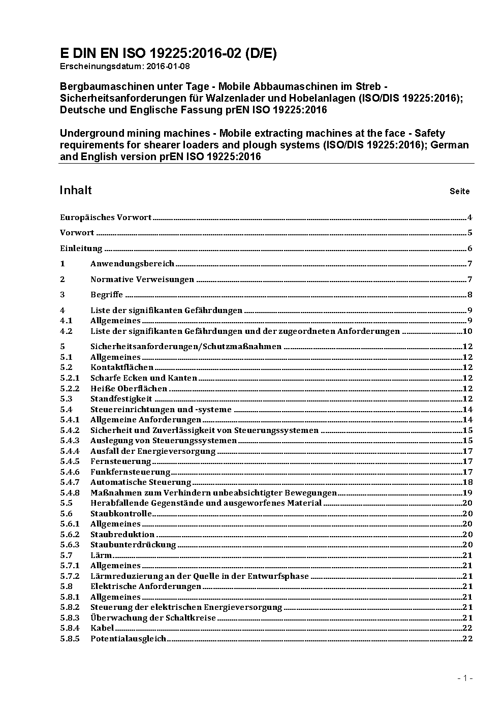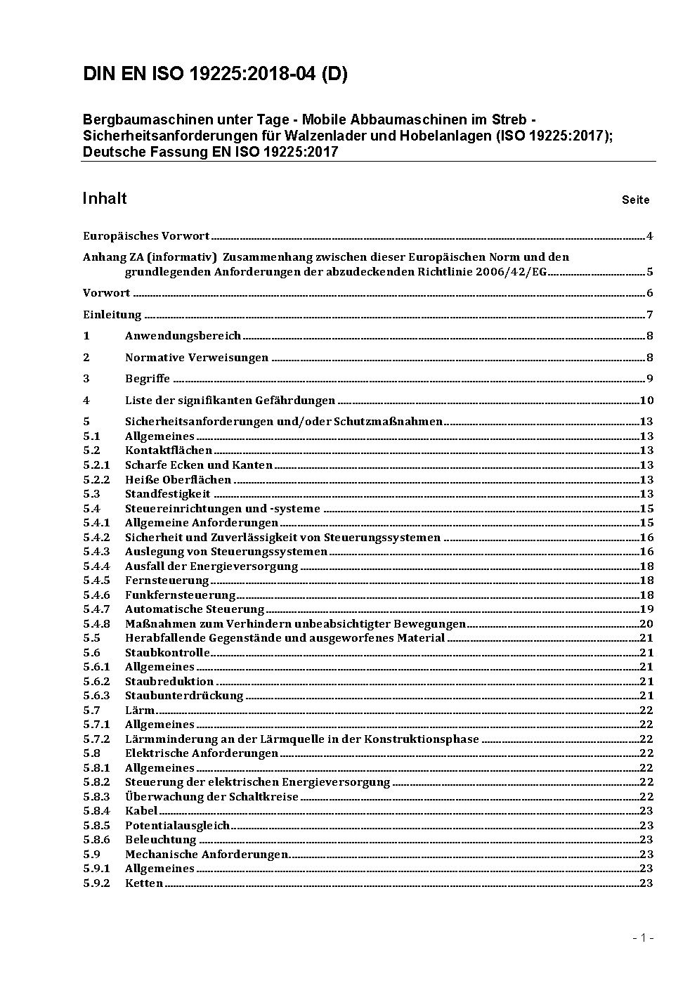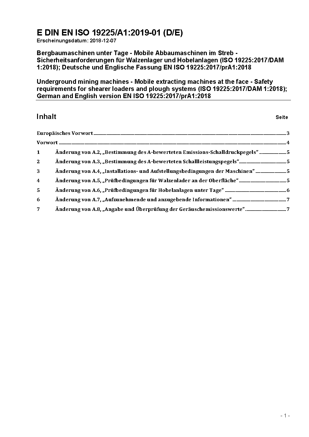Bergbaumaschinen unter Tage - Mobile Abbaumaschinen im Streb - Sicherheitsanforderungen für Walzenlader und Hobelanlagen (ISO 19225:2017 + Amd 1:2019); Deutsche Fassung EN ISO 19225:2017 + A1:2019