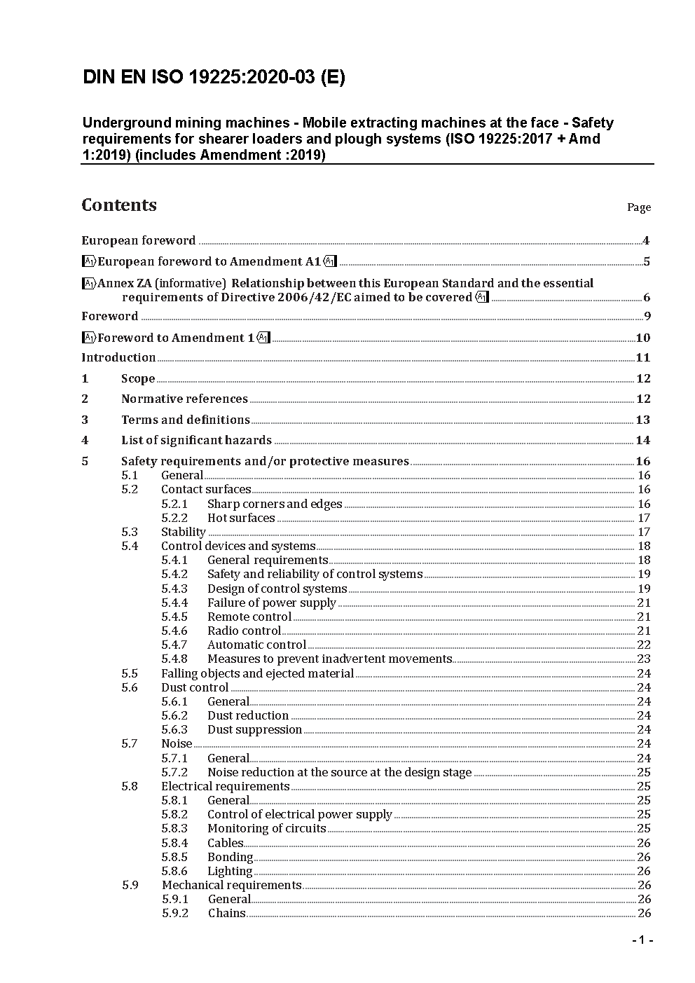 Underground mining machines - Mobile extracting machines at the face - Safety requirements for shearer loaders and plough systems (ISO 19225:2017 + Amd 1:2019); German version EN ISO 19225:2017 + A1:2019