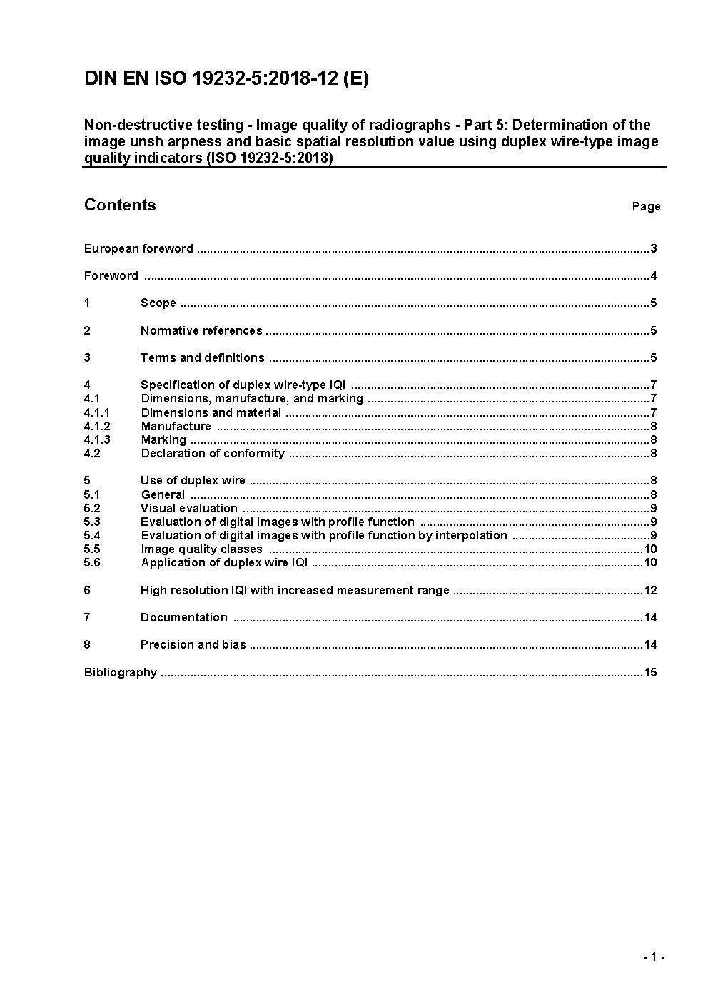 Non-destructive testing - Image quality of radiographs - Part 5: Determination of the image unsharpness and basic spatial resolution value using duplex wire-type image quality indicators (ISO 19232-5:2018); German version EN ISO 19232-5:2018